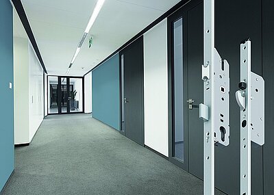 Die automatische Panik-Mehrfachverriegelung »Autosafe 837P« wurde speziell für den Einsatz bei Objekt- und Durchgangstüren entwickelt, die hohe Anforderungen an Sicherheit und Überwachung stellen. Damit nur berechtigte Personen Zutritt erhalten, befindet sich der Außendrücker in der Grundstellung im Leerlauf. Für eine Türöffnung wird dieser über eine Zutrittskontrolle elektrisch aktiviert. Dies kann sowohl für eine kurzzeitige oder ständige Begehbarkeit der Tür erfolgen. Das Schloss überzeugt durch zahlreiche Features. So unter anderem durch vielfältige Rückmeldungen zu verschiedenen Zustandsabfragen, durch die universelle Spannungsversorgung mit 12 oder 24 Volt oder aber durch die Umstellbarkeit von Arbeitsstrom auf Ruhestrom. Grundsätzlich ist die Nutzung sowohl im Stand-alone-Betrieb als auch mit einem der beiden »I/O«-Module »mini« oder »plus« möglich.