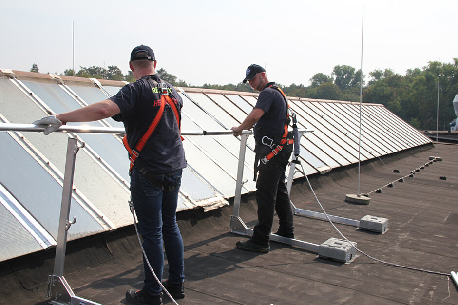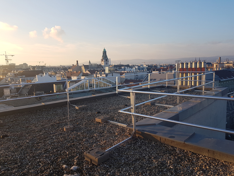 Es handelt sich um ein flexibles Geländersystem, das individuell an die spezifischen Anforderungen eines Objektes angepasst werden kann. So bietet es auch Lösungen zur Überbrückung von Gefälledifferenzen auf dem Dach oder für besonders enge Dachflächen mit zahlreichen technischen Aufbauten. Neben der Sicherung von Dachabsturzkanten ist »Guard« auch zur Umwehrung von Dachzugängen, Lichtkuppeln und Oberlichtern geeignet sowie für die seitliche Begrenzung von Wartungs- und Rettungswegen. Das Betreten der Dachflächen ist bereits ab einer Person, ohne PSA und somit auch ohne besondere PSA-Schulung und -Einweisung vor Ort gestattet. J