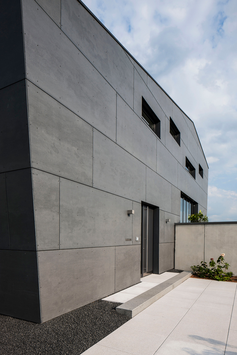 Die »Cembrit Patina Original« ist eine unbeschichtete Tafel aus Faserzement und ähnelt optisch dem Sichtbeton – das gilt vor allem für Tafeln in einem Grau- oder Beigeton. Anders als eine Fassade aus Sichtbeton ist eine Fassade, die mit Faserzementtafeln bekleidet wurde, nach Angaben von Cembrit aber leicht revisionierbar und auch vollständig recycelbar. Kosten für aufwendige statische Maßnahmen und Armierung würden eingespart, denn die Gesamtkonstruktion wiege weniger als eine Betonfassade und reduziere damit die Anforderungen an die Statik des gesamten Gebäudes.