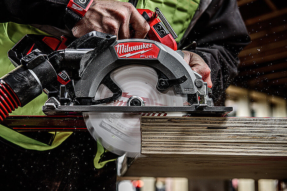Das Stufengetriebe der neuen Milwaukee-Akku-Kreissäge erlaubt eine maximale Schnitttiefe von 66 mm. Dabei arbeitet sich das 165-mm-Sägeblatt kraftvoll und so schnell durch das Material, wie das bisher nur mit kabelgebundenen Geräten möglich war. Selbst bei anspruchsvollen Trennschnitten arbeitet die Kreissäge mit konstanter Geschwindigkeit und ohne zu blockieren oder zu überhitzen. In Kombination mit einem 5,5-Ah-High-Output-Akku lassen sich bis zu 400 Schnitte in Kiefernholz mit den Abmessungen 90 x 35 mm realisieren. Schrägschnitte sind von 0 bis 45 ° möglich, zusätzlich erweitert eine -5 °-Einstellung den Anwendungsbereich.