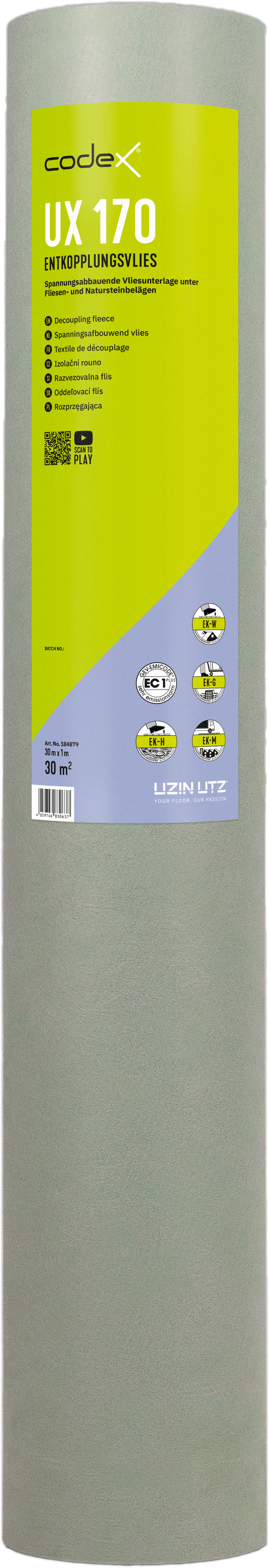 »Codex UX 170« ist ein neu entwickeltes Entkopplungsvlies, das dazu dient, gezielt Spannungen aus Zug- und Scherkräften zwischen Untergrund und Belag – speziell unter Großformat – abzubauen. Ihre gute Zugfestigkeit garantiert zudem eine zuverlässige Rissüberbrückung. Und so funktioniert‘s: Liegt ein kritischer Untergrund vor, zum Beispiel ein Fertigteilestrich oder alte Estriche in der Sanierung, fungiert das mit Dünnbettmörtel verklebte »codex UX 170« als spannungsausgleichende, textile Zwischenlage und gewährleistet damit eine hohe Verbundsicherheit.