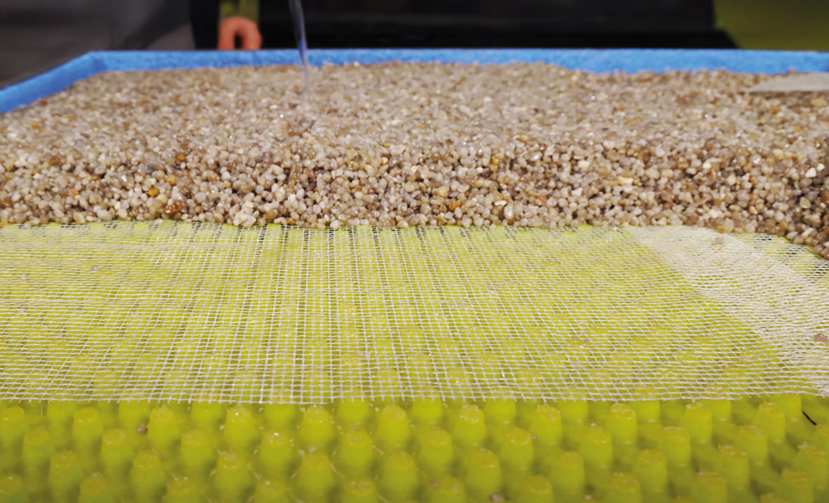 Das Verlegen der »Codex DM 10« könnte einfacher kaum sein. Die Matte wird mit der glatten Rückseite auf die Abdichtung ausgerollt. Die mit 5 cm überstehenden Gewebestreifen ermöglichen ein unkompliziertes Aneinanderfügen der Bahnen. Dank der SBR-Beschichtung des aufkaschierten Gewebes ist die Belagsverlegung mit einem zementären oder Epoxiddrainagemörtel problemlos möglich. Das lösemittelfreie System mit klar definierten Verarbeitungshinweisen ist langfristig und nachhaltig einsetzbar.