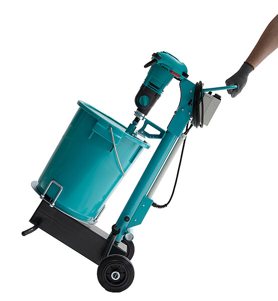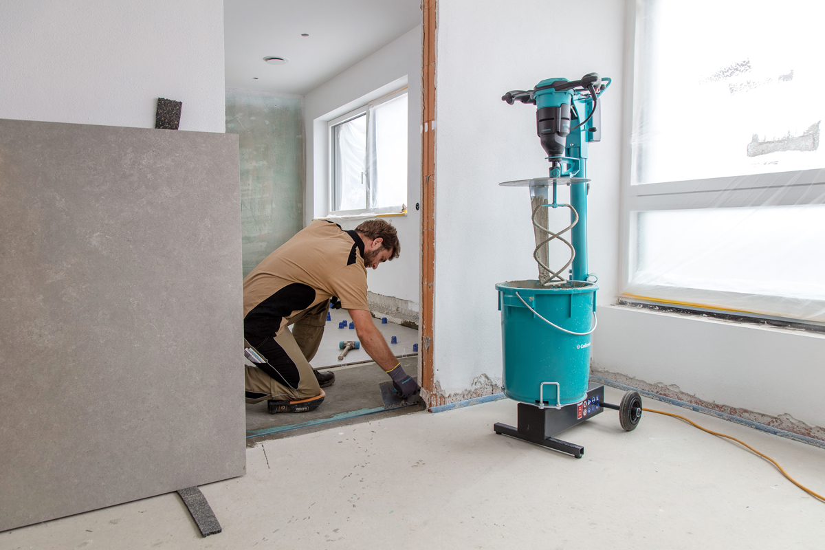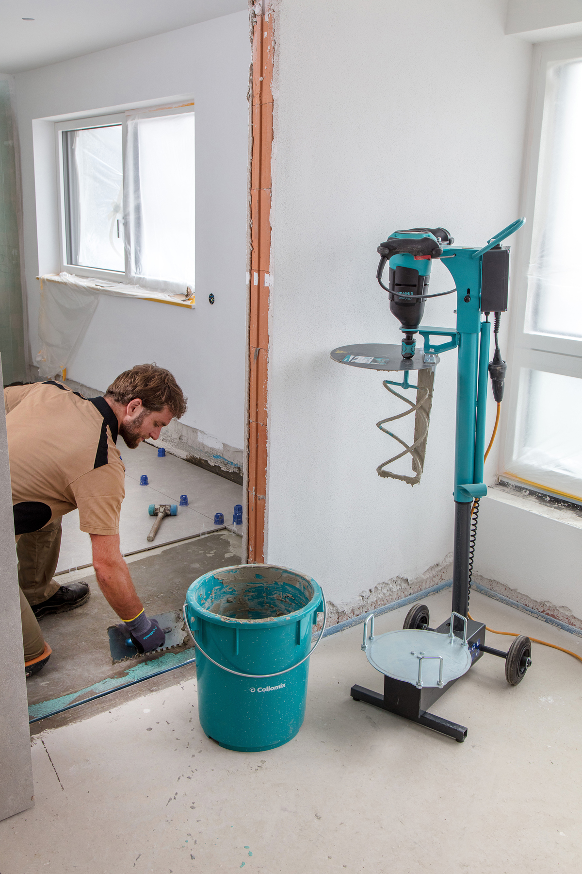 Besonders hervorzuheben ist die deutliche Geräuschreduzierung des Antriebsmotors, der erheblich leiser ist, was das Arbeiten deutlich angenehmer macht. Zum Entnehmen des fertig gemischten Materials wird das Mischwerk mit Unterstützung einer Gasdruckfeder mühelos hochgefahren und der Mischeimer kann einfach aus der Maschine gehoben werden. Damit ist es möglich, bei größeren Objekten unmittelbar den nächsten Mischvorgang zu starten. Dank des groß dimensionierten Rührers und eines Randabstreifers wird das gesamte Pulvermaterial rückstandsfrei erfasst und durchmengt. Der sich mitdrehende Mischeimer verstärkt damit den Mischeffekt. Das Resultat ist ein geschmeidiger, cremiger Klebemörtel ohne Klumpen, der sich schnell und problemlos verarbeiten lässt.