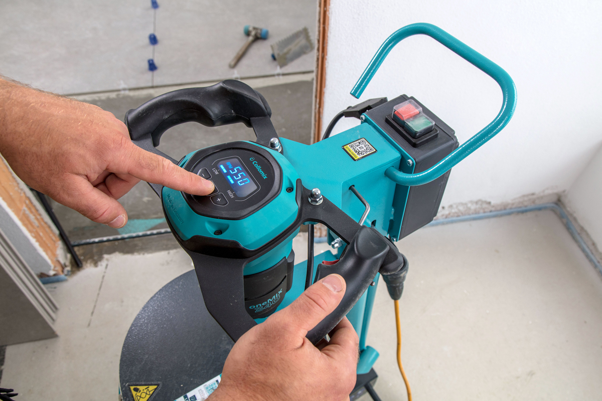 Besonders bei Ein-Mann-Baustellen ist der »oneMix 340« der »zweite Mann«. Der Handwerker kann sich ganz auf seine Arbeit konzentrieren, denn das Mischen erfolgt in der Maschine automatisch. Insbesondere das neue, innovative Antriebskonzept lässt den »oneMix 340« in die Liga normalerweise größerer Maschinen vorstoßen. Die Drehzahl des Mischwerkzeugs lässt sich digital auf drei Geschwindigkeitsstufen einstellen, sodass das jeweilige Material konstant mit der korrekten Geschwindigkeit gemischt wird. Ein weiterer Faktor für die optimale Qualität ist die richtige Dauer des Mischvorgangs. Hier ist der »oneMix 340« mit einen Timer ausgestattet, mit dem sich die gewünschte Mischzeit vorwählen lässt. Diese ist in 30-Sekunden-Schritten bis maximal sechs Minuten einstellbar, nach Ablauf der Zeit stoppt die Maschine selbstständig. Damit wird unter anderem ein »Übermischen« des Materials verhindert.