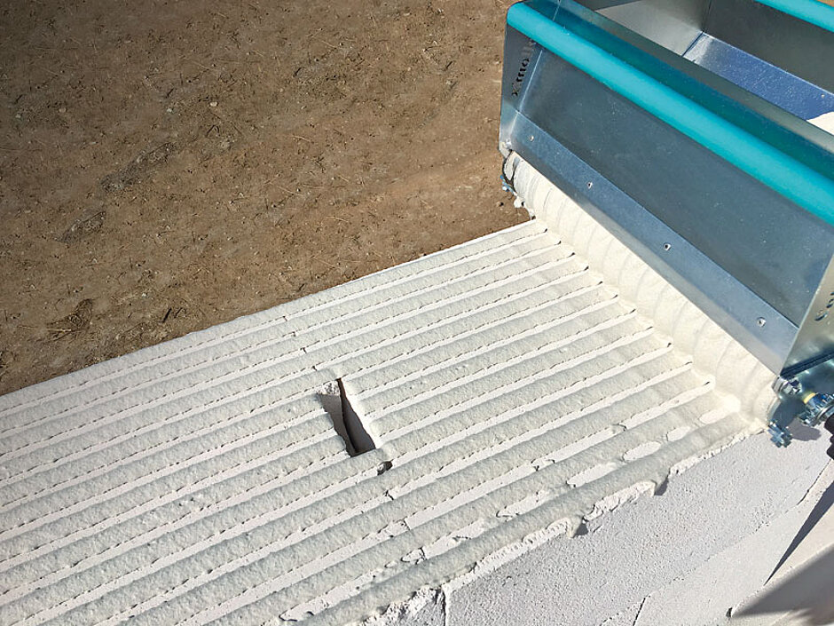 Damit die Auftragsrolle zuverlässig angetrieben wird, ist die »MR-PB« mit gezackten Antriebsrädern aus Metall ausgerüstet, die rutschsicher auf der Steinoberfläche greifen. Sie sorgen für eine reibungslose Kraftübertragung und einen gleichmäßigen Auftrag der Mörtelstreifen. Die Rolle kann mit einem Handrad auch manuell gedreht werden. Damit kann der Kleber bereits von Beginn der Steinreihe an auf die Oberfläche aufgetragen werden. Das Ergebnis sind komplett durchgehende Mörtelstreifen. Die Rolle besteht vollständig aus Stahlblech und ist somit widerstandsfähig und leicht zu reinigen.