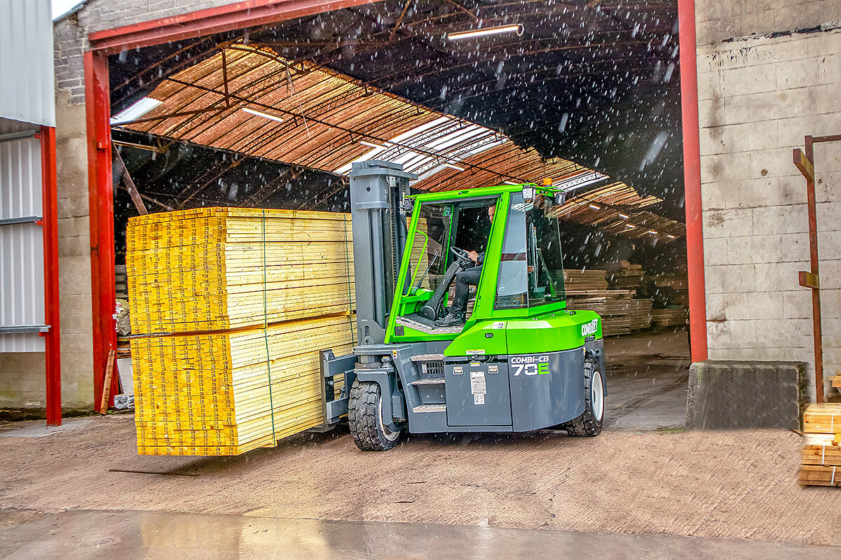 Der »Combi-CB70E« ist ein elektrisch angetriebener Mehrwege-Gegengewichtsstapler mit einer Tragfähigkeit von 7 t, und er ist für das Handling langer und sperriger Lasten auf engem Raum konzipiert. Ausgestattet mit der unabhängigen Traktionskontrolle und großen elastischen Gummireifen, ist er auch auf unebenem Untergrund sicher unterwegs und arbeitet gleichzeitig emissionsfrei. Die geräumige, gefederte Kabine mit Rundumverglasung und der »Auto Swivel Seat« – der sich je nach Fahrtrichtung automatisch um 15 ° nach links oder rechts dreht – sorgen für optimale Ergonomie und Komfort für das Bedienpersonal, auch bei längeren Schichten.