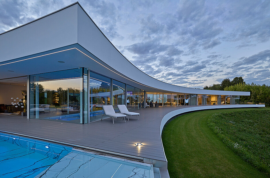 Mit ihrem natürlichen Aussehen, den innovativen Materialien und dem speziellen Design passen die »Twinson«-Terrassensysteme in eine natürliche Umgebung. Sie bilden eine harmonische Einheit mit dem berühmten polnischen Dünenhaus, das inmitten grüner Wiesen auf einem Hügel mit Blick auf den Fluss Narew liegt. Die kubistische Form und das minimalistische Design der über 1 500 m2 großen Anlage wurden bei den European Property Awards 2023 – 2024, die oft als »Oscars der Immobilienbranche« bezeichnet werden, in der Kategorie »Architecture Single Residence« ausgezeichnet. Das weitläufige Gebäude erhebt sich sanft aus dem Hang und bleibt von der Zufahrtsstraße aus unsichtbar. Die geschwungene Form, die der Biegung des Flusses folgt, verfügt über eine vollständig überdachte Terrasse, die sich über mehrere Hundert Meter erstreckt und das Haus zur weiten Landschaft hin öffnet. Das beeindruckende Projekt in der Nähe von Warschau realisierte Przemek Olczyk, Gründer des Designstudios Mobius Architekci.