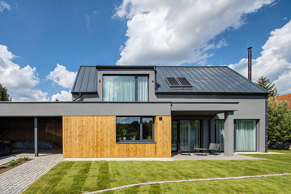Alle Fenster und Türen, einschließlich der Eingangstür, sind mit PVC-Profilen des Systems »Elegant Abstract« in Anthrazit aus dem Hause Deceuninck ausgestattet. »Ursprünglich hatte ich Aluminiumfenster empfohlen, aber dann fiel mir zufällig ein Muster der ›Elegant‹-Profile in die Hände und ich war wirklich positiv überrascht von dem Design, das von Aluminium nicht zu unterscheiden ist. Und ein weiterer Vorteil: Der Preis ist auch ansprechender«, sagt Tereza Dvořáková, die ausführende Architektin von A3 Architects in Prag. Das Anthrazit passt sowohl zu der grauen Fassade des Hauses als auch zu der Holzverkleidung aus Thermokiefer, die diese ergänzt. Die Wahl fiel schlussendlich auch aufgrund des modernen und architektonisch ansprechenden Designs, wie einer schmalen flächenbündigen Ansicht, schlanken Überschlägen und kubischen Glasleisten.