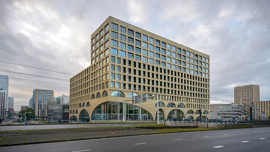 Das Objekt »Westbeat«, das auf Basis eines Entwurfs des niederländischen Architekturbüros Studioninedots entstanden ist, wirkt mit seinen zwölf Geschossen und der massiven Backsteinfassade wie ein Monument. Ein Eindruck, der durch die strenge Gliederung der Fenster in den oberen Geschossen unterstützt, durch die in unterschiedlicher Ausprägung gestalteten Rundbögen im Sockelbereich jedoch wieder aufgebrochen wird. Der sandfarbene Ziegel wurde von der Klinkermanufaktur Deppe Backstein aus Uelsen entwickelt und produziert.