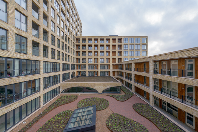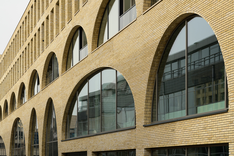 Der Baukomplex richtet sich insbesondere an eine junge Zielgruppe auf der Suche nach einem kreativen und bezahlbaren Umfeld zum Arbeiten und Leben. Und so befinden sich in dem Neubau auf rund 24 300 m2 Bruttogeschossfläche 150 Mietwohnungen, ein Gemeinschaftsgarten, eine Tiefgarage sowie öffentlicher Raum für vielfältige Nutzungen. Während sich die privaten Nutzungseinheiten in der Fassade durch hochformatige Fenster abzeichnen, unterstreichen die bogenförmigen Öffnungen die öffentliche Nutzung des Sockels. Die größte, über Eck verlaufende Bogenform nimmt drei Geschosse ein und kennzeichnet den Eingang, der direkt in die öffentlich zugänglichen Bereiche mündet. Diese verteilen sich auf drei Ebenen und wurden von Studioninedots bewusst nicht für eine spezifische Nutzung ausgebaut.