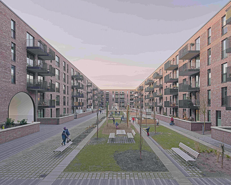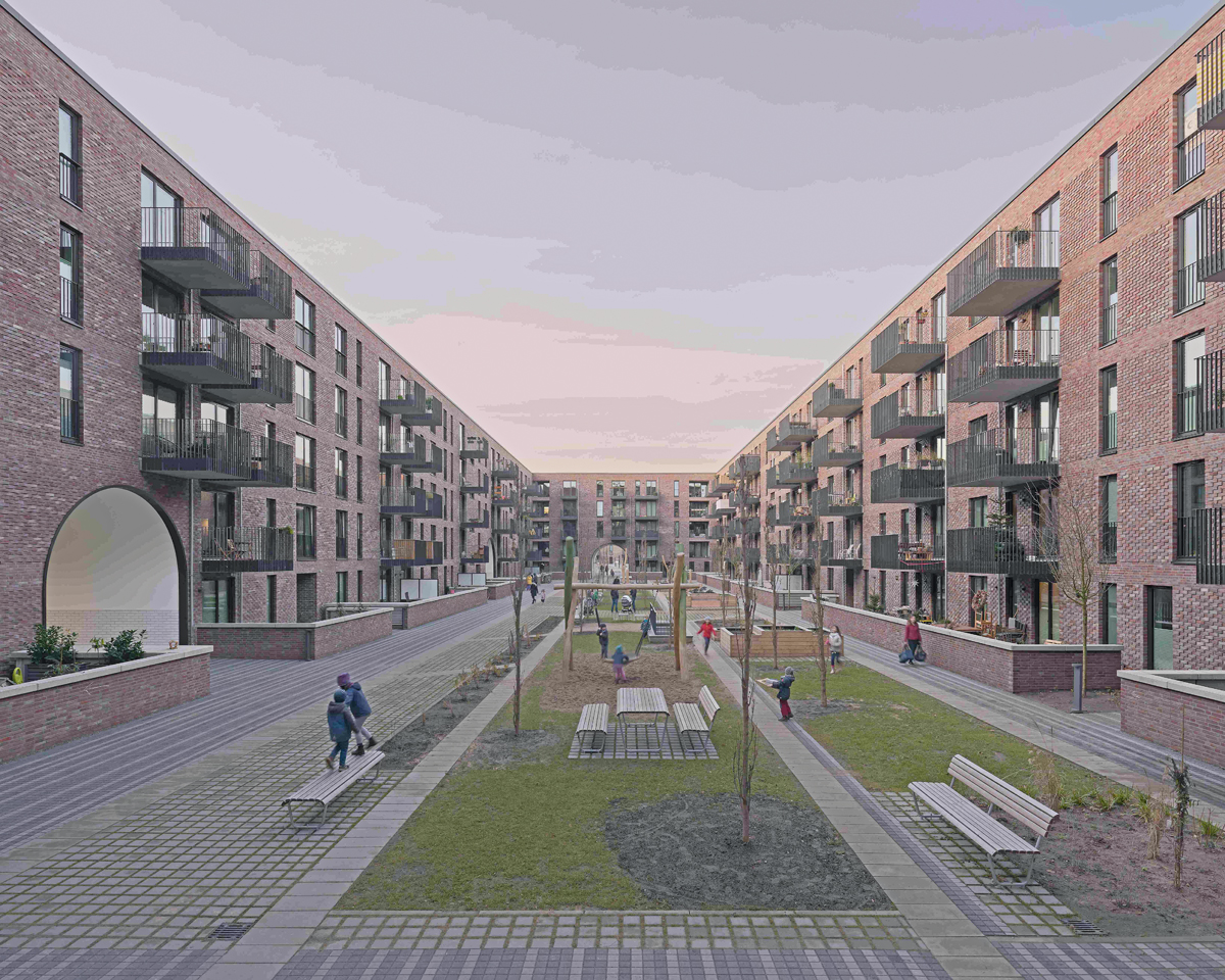 Großmaßstäblich und weitläufig angelegt, soll sich das Pergolenviertel an die Architektur der 1920er Jahre anlehnen und so an die Tradition »guten Bauens« anknüpfen. Ganz im Sinne dieser Maxime stellt hartgebrannter Backstein das wichtigste Baumaterial des Quartiers dar. Dessen reiche Farbpalette sowie die gezielte Setzung der Steine, die das Spiel mit Details erlaubt, gewährleistet bei aller Homogenität Eigenständigkeit und Diversität auf den einzelnen Baufeldern. So prägt Backstein als dominierendes Fassadenmaterial auch die durch kbnk geplanten Baukörper, die sich durch eine ganz eigene Interpretation der vordefinierten Maßgaben hervorheben. Die Klinkermanufaktur Deppe Backstein-Keramik aus der Grafschaft Bentheim hat den speziellen Kohlebrandklinker, der dieser Einheit im Pergolenviertel eine eigene visuelle Identität verleiht, entwickelt und produziert.