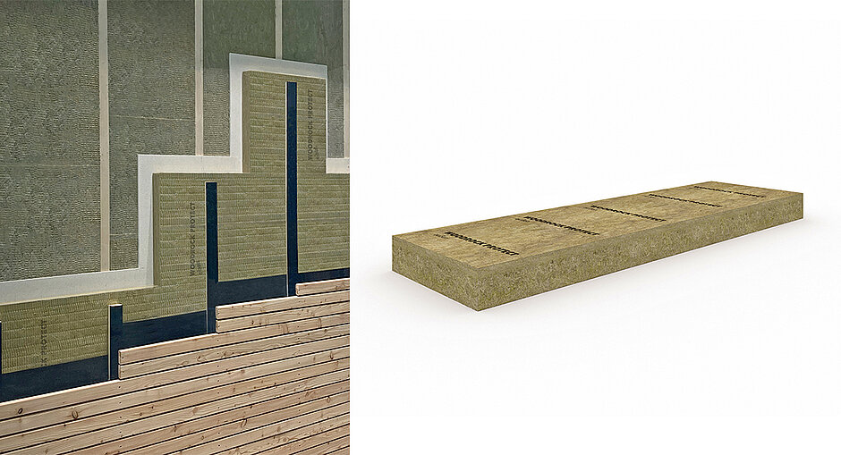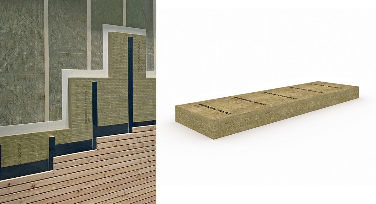 Die Fassadendämmplatte »Woodrock Protect« wurde von Rockwool speziell für belüftete Außenwandkonstruktionen im Holzbau entwickelt. Dank ihrer brandschutztechnischen Eigenschaften – nicht brennbar A1 mit einem Schmelzpunkt > 1000 °C – ist sie auch für den mehrgeschossigen Holzbau geeignet.