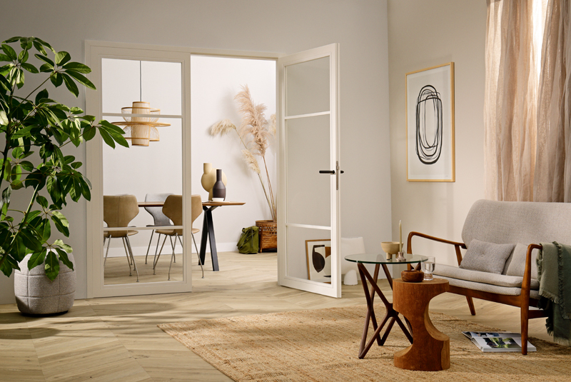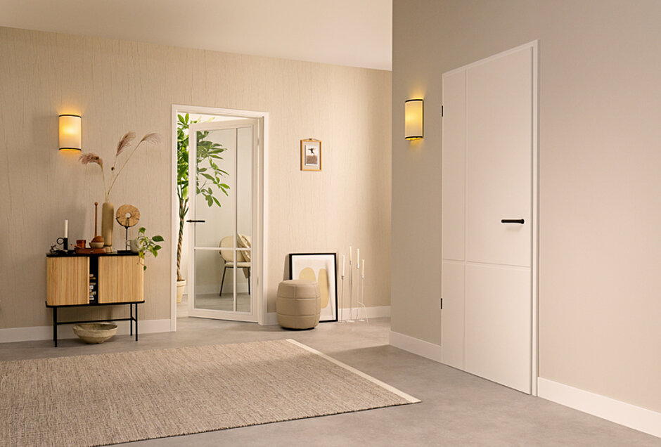Minimierte Rahmen bestimmen das schlanke Design. Feine Linienfräsungen setzen zusätzliche Akzente – passend zum Trend eines minimalistischen Einrichtungsstils. Das unterstützen bei den Glastüren die zarten Leisten zwischen den Glaselementen und das sorgt laut dextüra für ein elegantes »Industrial«-Zitat. Minimalismus bietet zudem die Kombination von »Form« mit den XS-Zargen von dextüra: 90 mm umlaufender Rahmen in der Tür und 45 mm Zarge.