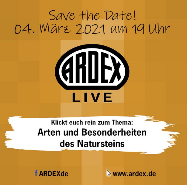 Bereits im Februar ist die neue Reihe gestartet. Am 4. März findet die nächste ARDEX-Live-Sendung zum Thema „Arten und Besonderheiten des Natursteins“ statt. Dann folgen einmal im Monat weitere Live-Schulungen – immer donnerstags um 19 Uhr. Die Sendungen werden auf Facebook ausgestrahlt, sind aber auch über www.ardex.de oder über die entsprechende Kachel in der ARDEXIA-App erreichbar. Alle Videos sind zudem unter www.ardex.de/service/ardex-live und im Ardex-YouTube-Kanal verfügbar.