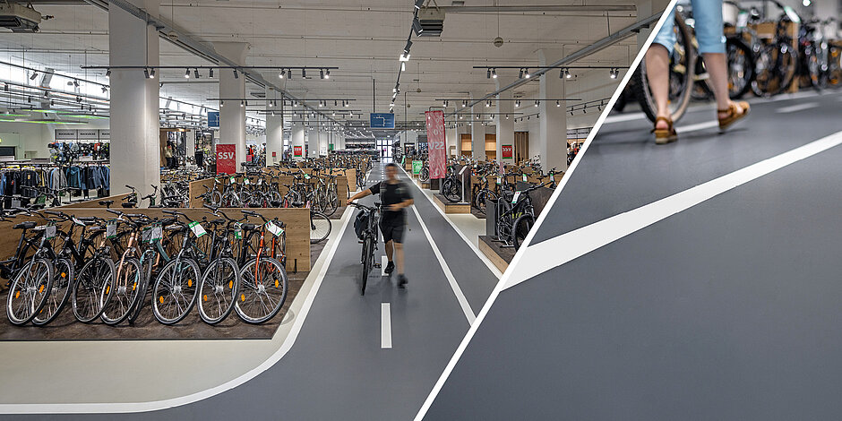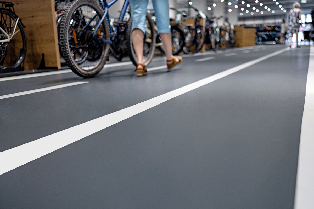 Die Anforderungen an die Böden dieser Verkaufsstellen – es handelt sich meist um Bestandsbauten mit unterschiedlichsten Herausforderungen in Bezug auf die Beschichtung – sind vielfältig. Denn neben ansprechender Optik werden vor allem Verschleißfestigkeit und Langlebigkeit gefordert. Im Zuge dessen hatte man die Idee, den Boden wie eine Straßenlandschaft zu gestalten: Auf einer hellgrauen Grundfläche werden »Straßen« in einem dunklen Asphaltgrau inklusive Seiten- und Mittelstreifen sowie Zebrastreifen dargestellt. Interessenten können so auf speziell dafür ausgewiesenen Strecken die Räder vor Ort testen. Währenddessen können die übrigen Besucher, so sie sich ebenfalls an die Markierung halten, ungestört im Markt das Angebot in Augenschein nehmen. Nicht zuletzt fällt der Reifenabrieb auf den dunklen Flächen optisch weniger ins Gewicht als auf den hellen Bereichen.