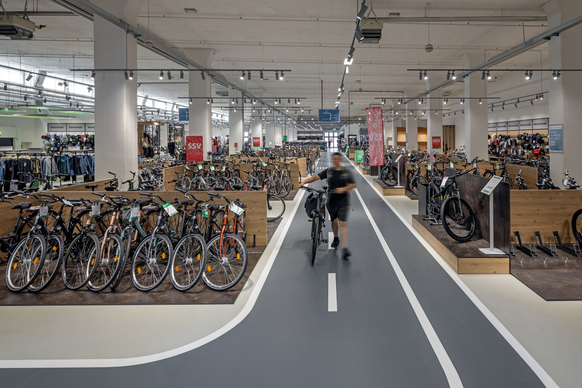 Platz für Indoor-Testfahrten ist in Karlsruhe reichlich vorhanden: Auf rund 2 500 m2 lassen sich E-Bikes, Renn- oder Kinderräder optimal auf ihre Fahreigenschaften hin überprüfen. Ausführendes Unternehmen war die Firma Rödling Beschichtungssysteme, die seit 2008 sämtliche Märkte der B.O.C. mit dieser innovativen Bodengestaltung versieht. Bis September 2022 wurden bereits 20 Märkte derart gestaltet, weitere folgen nach und nach. Die durchweg hohe Ausführungsqualität sei nicht zuletzt auch dadurch gewährleistet, dass der Geschäftsführer Roland Rödling selbst immer mitarbeitet – und so im wahrsten Sinne des Wortes die »Bodenhaftung» behält.