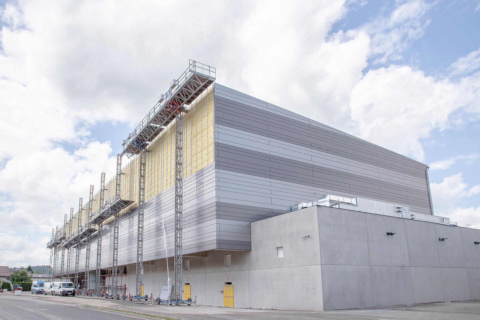 Wilhelm Wiesbauer, Prokurist bei Starzinger, betont: »Die Herausforderung bei der Planung des Verladezentrums Süd war, neben der erforderlichen kurzen Ausführungszeit auch die hohen Anforderungen an Statik, Schall- und Brandschutz zu erfüllen. Die Lagerfläche des 12,40 m hohen Obergeschosses musste in fünf Brandabschnitte und mit vier Brandwänden bis zur Dachunterkante ausgeführt werden. Die perfekte Lösung bot uns Domico mit ihrem geprüften und EI90-klassifizierten Wandsystem aus Kassetten, Steinwolle und der ›Planum‹-Fassade auf Stahlbetonstützen. Neben dem Brandschutz konnten wir hiermit auch die schalltechnischen Anforderungen für den Anrainerschutz erfüllen. Um den statischen Anforderungen gerecht zu werden und mit Blick auf den engen Zeitplan zur Fertigstellung, entschieden wir uns bei der Planung der Dachkonstruktion für das Domico-Element-Dach«, ergänzt Wiesbauer.