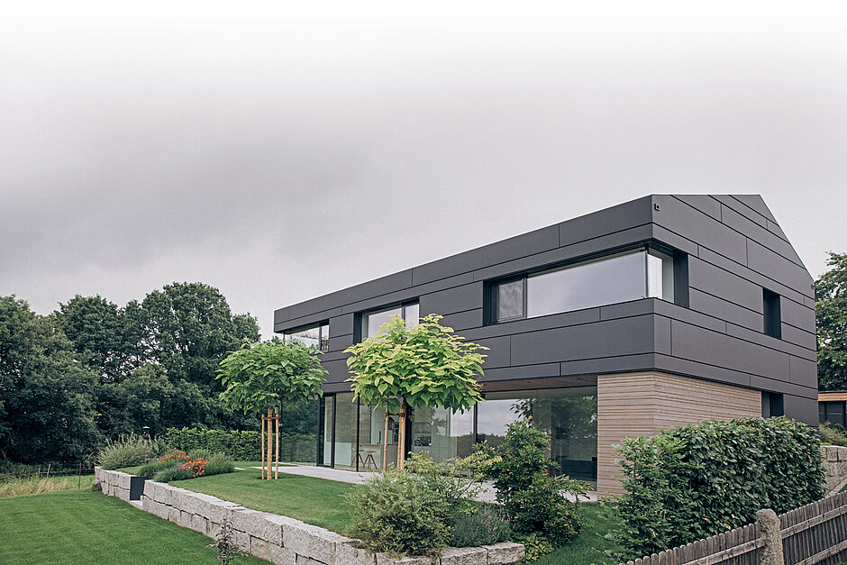 Im deutschen Örtchen Hammerharlesberg wurde in ländlicher Gegend ein Haus geplant und errichtet, bei dem Reichl-Trinkner auf die spannende Materialkombination aus Metall und Naturmaterialien setzte. Großflächige Glasflächen mit rahmenlosen Fensterelementen, Granit und Holz stehen im Kontrast zu der glatten Oberfläche der Metallfassade. Die Domico-Profile in dunklem Grau sind jedoch mehr als ein optischer Hingucker und Designelement. Die Grundkonstruktion des Gebäudes aus Beton und Ziegel wurde mit der vorgehängten Fassade verkleidet. Durch die Distanz zwischen Mauerwerk und Fassadenprofilen wird eine Hinterlüftung möglich, die fast nebenbei vielerlei Technik schluckt. Installationen, Entwässerung oder auch Sonnenschutz können Bauherren darin verschwinden lassen. Weder Befestigungsmaterial noch ungewollte Stöße lenken von den bewusst gewählten architektonischen Linien ab. Das Gebäude wirkt ruhig und klar.