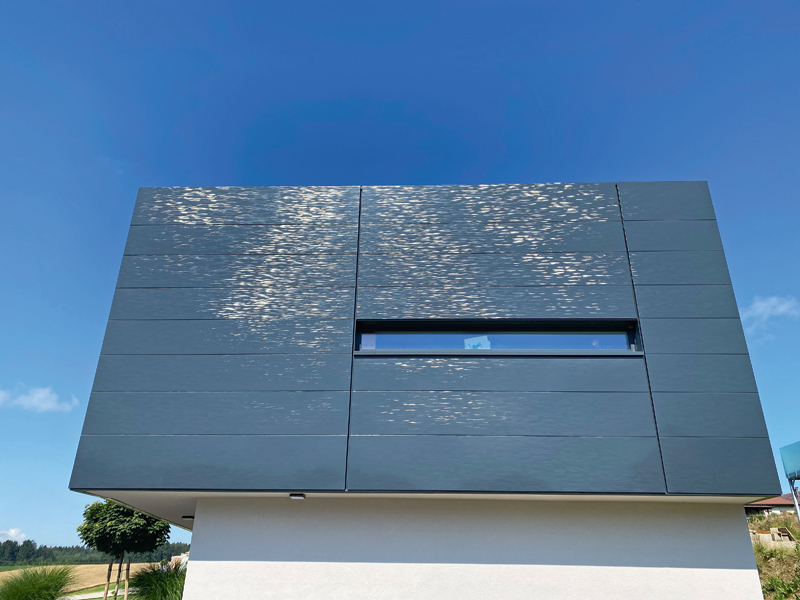 Bei Profilen aus Stahlblech kann bei der »Wave« zwischen Schwarz und Weiß gewählt werden. Die Musterstruktur ist horizontal ausgerichtet. Der Glanzgrad liegt laut Hersteller bei ca. 40 Prozent. Der mehrschichtige Beschichtungsaufbau hat eine Gesamtdicke von 40 µm. Die neue »Wave«-Beschichtung kann als Planum- oder Swing-Fassade ausgeführt werden. Die vorgehängten, hinterlüfteten Metallfassaden von Domico sind nach eigenen Angaben durchdringungs- und nahezu wartungsfrei. J