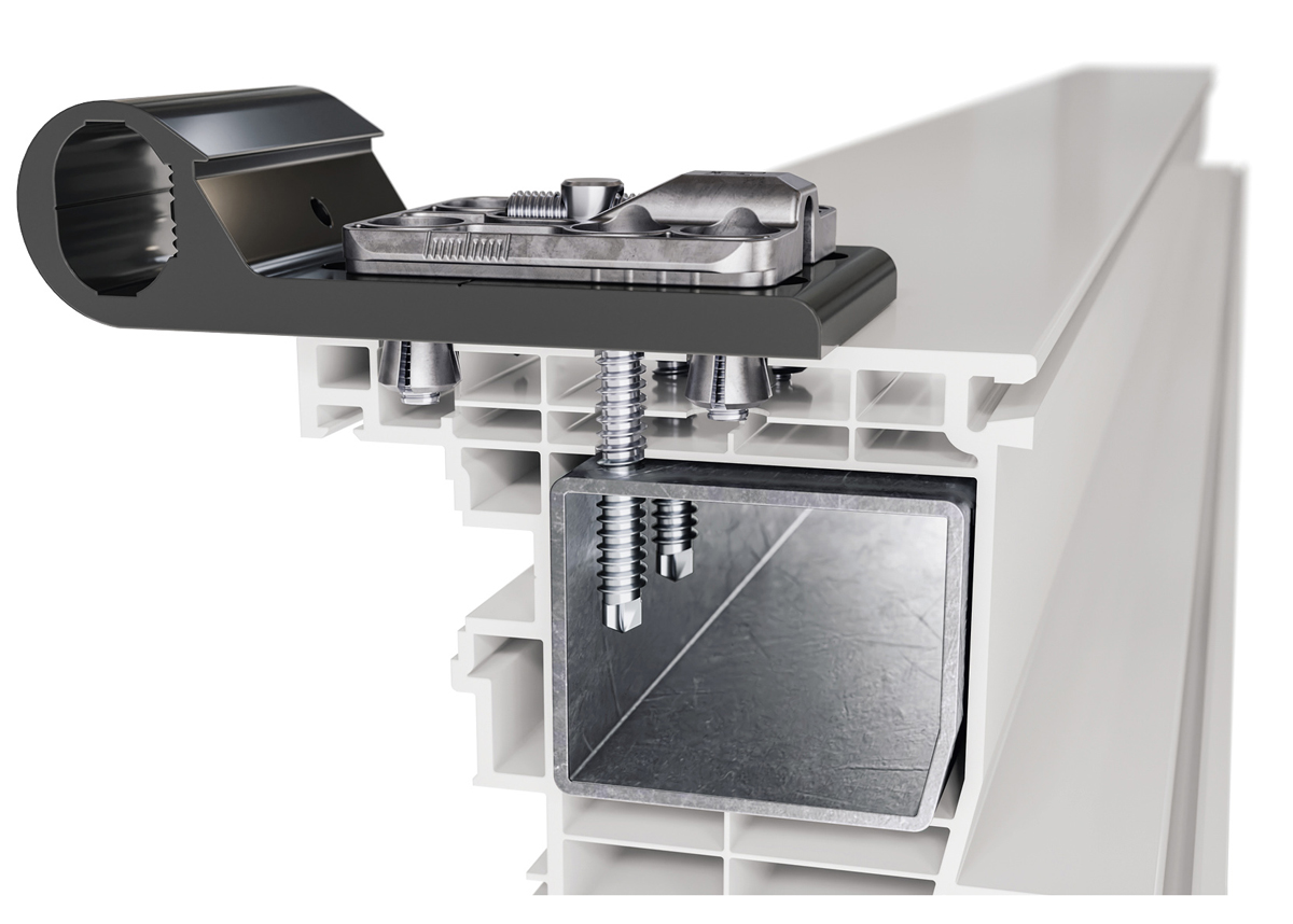 Mit seiner Weiterentwicklung des von Dr. Hahn patentierten »KT-Fix«-Befestigungselements haben die Innovationsführer aus Mönchengladbach wieder eine passende Lösung entwickelt. Das »Hahn KT-Fix compact« befestigt das Flügelbandteil der sehr verbreiteten Bandserien »Hahn KT-V 6R« und »Hahn KT-B 6R« nun mit vier kurzen Zapfen, die sich in niedrigen Vorkammern verspreizen. In aller Regel muss dazu nicht bis in die Stahlarmierung gebohrt werden. Eine Bohrtiefe von 10 mm reicht aus. Das beschleunigt die Verarbeitung in der Werkstatt und vermeidet die Gefahr, das Profil durch den Austritt von Metallspänen zu zerkratzen. »KT-Fix compact« ist effektiv für den Lastabtrag auch bei ungünstigen Systemeigenschaften. Selbst bei Systemen ohne Stahl-Armierung oder mit Vorsatzschalen wird ein idealer Formschluss erreicht.