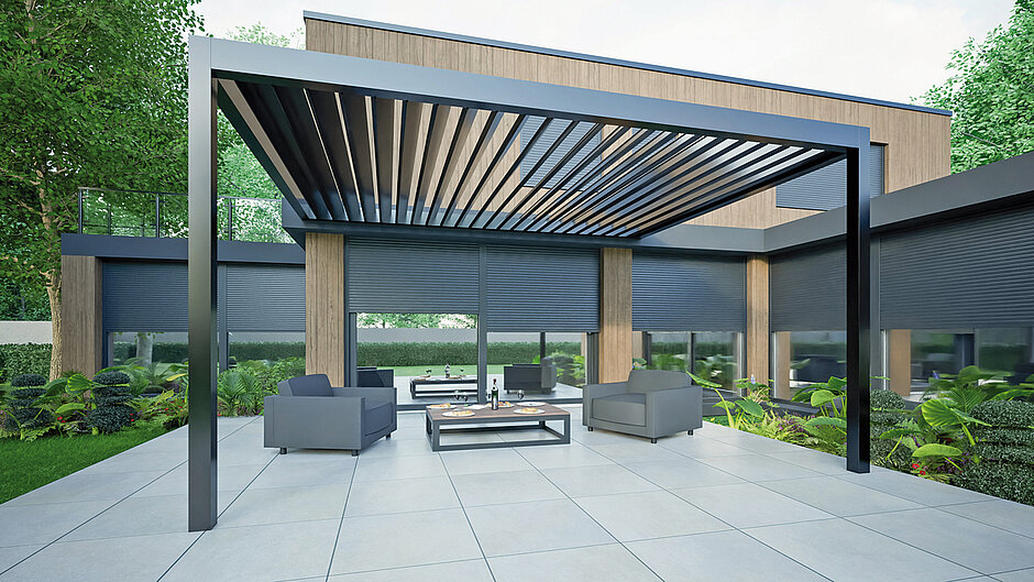 Die Pergola ist aus Aluminiumprofilen gefertigt. Sie besteht aus einer tragenden Struktur und einem zu öffnenden Dach. Der Drehwinkel der Latten reicht von 0˚ bis 110˚, wodurch die Überdachung leicht an unterschiedliche Wetterbedingungen angepasst werden kann. Die Dachlatten bilden eine dichte Verbindung mit der Struktur: Sowohl die Latten als auch der Rahmen sind mit einer innovativen Dichtung versehen.