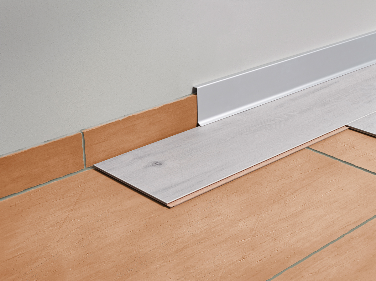 Mit einer Höhe von 80 mm und einer Tiefe von 11 mm passt die Leiste problemlos über bestehende Sockel. Zur Befestigung eignet sich der Polymerkleber »Speed-Flex« von Dural, der durch seine hohe Anfangsfestigkeit eine einfache und schnelle Montage ermöglicht. Passende Ecken, Verbinder und Endkappen runden das System ab. Neben der einfachen Verarbeitung überzeugt »Construct Reno« vor allem durch eine ansprechende Optik: Sowohl die Leiste selbst als auch die Zubehörteile bestehen aus eloxiertem Aluminium. Sie lassen sich daher leicht reinigen, sind robust und sorgen für einen dauerhaft ansprechenden Sockelbereich. Da die Sockelleiste mit einer Vielzahl von Materialien kombiniert werden kann, ist sie sowohl für Fliesen- als auch für Bodenleger interessant. Mit einer entsprechenden Entkopplung können auf bestehenden Fliesenflächen auch erneut Fliesen zum Einsatz kommen: »Durabase CI++« von Dural sorgt hier für den sicheren Untergrund.