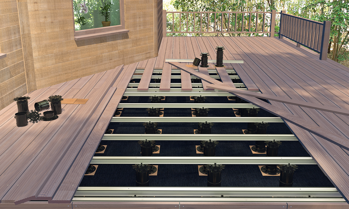 Die Terrasse benötigt stets einen stabilen Untergrund: Für die Verlegung der Unterkonstruktion liefert Eurotec Verstellfüße in unterschiedlichen Varianten und Höhen, welche auf den vorbereiteten Untergrund aufgestellt werden können. Diese lassen sich stufenlos in der Höhe justieren. Wenn Aufstellflächen für Verstellfüße nicht optimal ausgerichtet sind, können nivellierbare Stelzlager dank ihres beweglichen Kopfes Abhilfe schaffen. Mithilfe von formstabilen Aluminium-Systemprofilen wird im Gegensatz zu Holzprofilen eine langlebigere Unterkonstruktion geschaffen, um schließlich den gewünschten Belag aufzulegen und diesen zu befestigen.