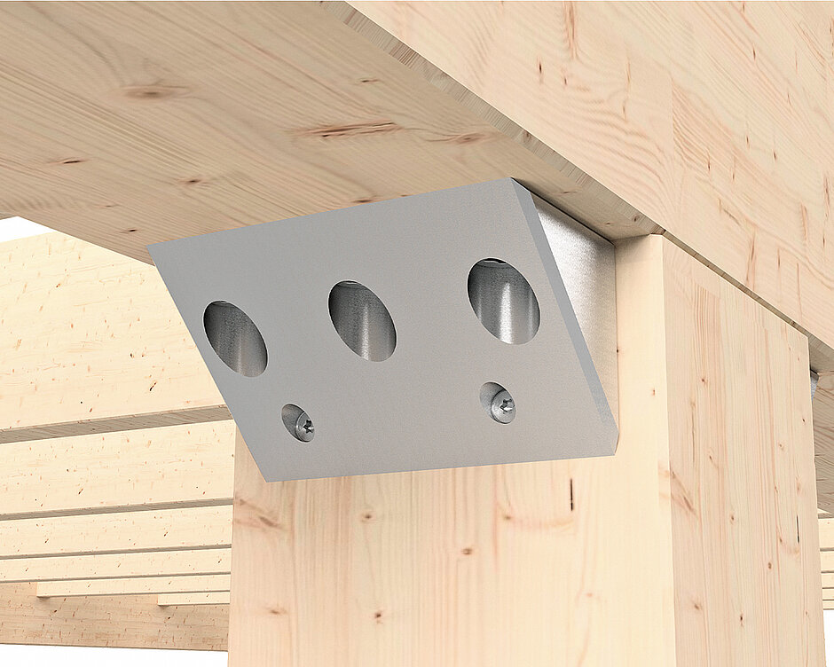 Um herkömmliche Kopfbänder zu vermeiden, bietet Eurotec den »EckTec«-Verbinder als praktische Alternative. Neben einer ansprechenden Optik erweist sich das Produkt gerade bei niedrigen Einbauhöhen als besonders vorteilhaft, da keine diagonalen Streben den Durchgang o. Ä. erschweren. Der Verbinder kann vielseitig eingesetzt werden – so findet dieser beispielsweise Anwendung bei dem Bau eines Carports oder einer Terrassenüberdachung, um entsprechende Bereiche barrierefrei nutzen zu können.