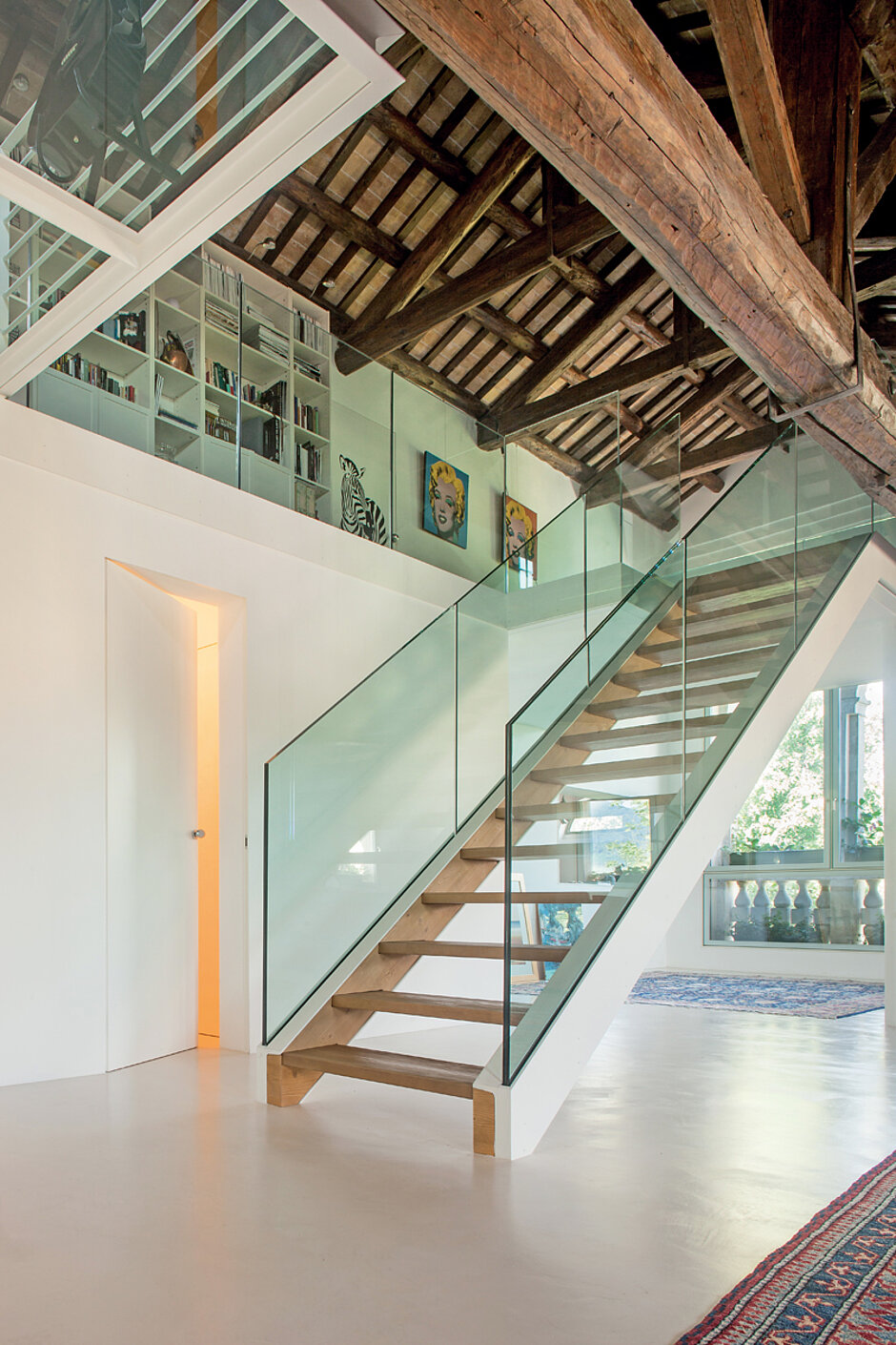 Begeistert erzählt Alberto Goldoni: »Von Anfang an stand für mich fest: Dieses Projekt sollte der perfekte Ort sein, um historische Elemente mit einem peppigen, modernen Wohnstil zu kombinieren.« Und so galt es zunächst, die historischen Elemente behutsam zu restaurieren und ihre ursprüngliche Anmutung wieder voll zum Tragen zu bringen. Denn gerade diese Zeitzeugen der Vergangenheit, der historische Sichtdachstuhl, die gerundeten Stahlstützen und die kunstvollen alten Fensterbögen, verleihen dem Loft seinen besonderen Charme. In puncto Innenarchitektur entschied sich der Bauherr für einen minimalistischen Stil: Klare Linien und kubische Formen geben den Ton an. Kombiniert mit modernen Materialien für Boden und Wände und einem fröhlich-frechen Wohnstil mit knalligen Farbenakzenten.