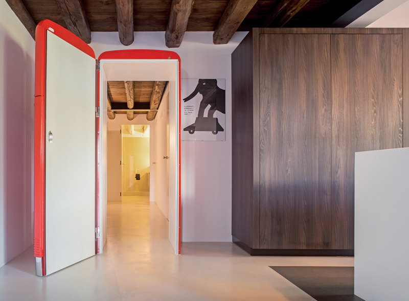 Die Küche überrascht mit einem originellen Detail. Der knallrote Kühlschrank im Nostalgie-Look der 50er-Jahre ist ein echter Designklassiger. Doch wer hätte es gedacht: Hinter der Kühlschranktür versteckt sich der Zugang zum Flur und den privaten Räumen. J