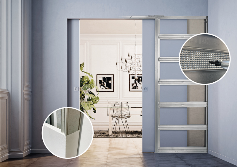 Ebenfalls neu ist die Kunstharzbeschichtung der Profile an den wandbündigen Schiebetürkästen. Diese Beschichtung erlaubt nach Angaben von Eclisse einen rascheren Auftrag der abschließenden Putz- bzw. Gipsschicht auf den Kanten und Flächen des Schiebetürkastens im Bereich der Durchgangsöffnung. Im Vergleich zur Vorgängerversion ist beim neuen Profil eine viel dünnere Gipsschicht erforderlich. Damit reduziere sich die Menge der Spachtelmasse um 80 Prozent und verkürze die Trocknungszeit deutlich, so Eclisse. J