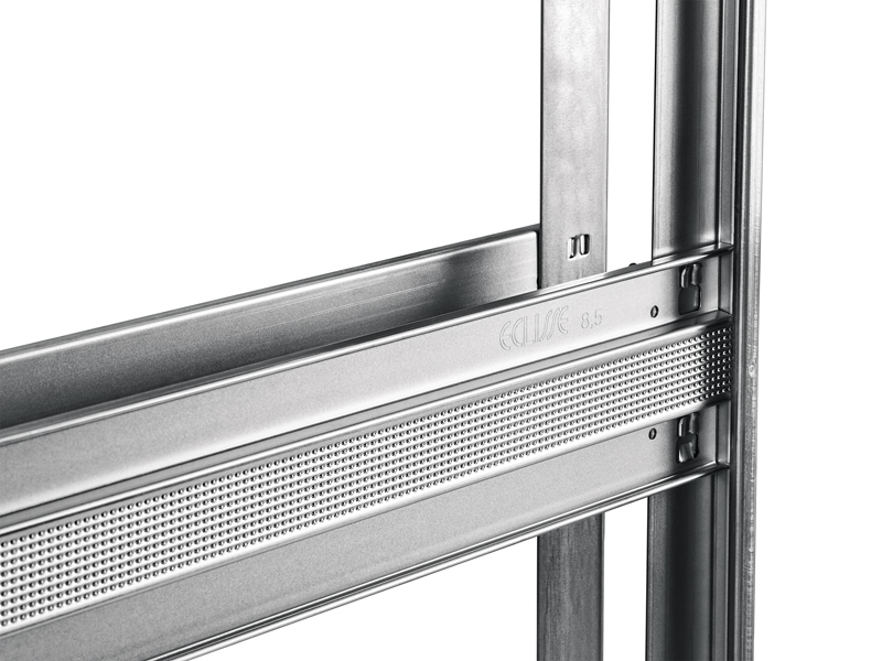 Eclisse hat die Querstreben des Einbaukastens der »Syntesis«-Serie weiterentwickelt: Dank einer Mikroperforierung und einer breiteren Abmessung geht die Montage nach Aussage des Herstellers nun noch schneller von der Hand. Beim Verschrauben der Gipskartonplatten mit den Querprofilen wird die Schraube so geführt, dass sie sich mit wenig Kraftaufwand einschrauben lässt, ganz ohne seitliches Abgleiten. Die Querstreben des Kastens spielen eine wichtige Rolle für den Gesamtaufbau des Systems, dem sie zusätzliche Festigkeit und Stabilität verleihen sollen. Eclisse hat sich diese Mikroperforierung patentrechtlich schützen lassen.
