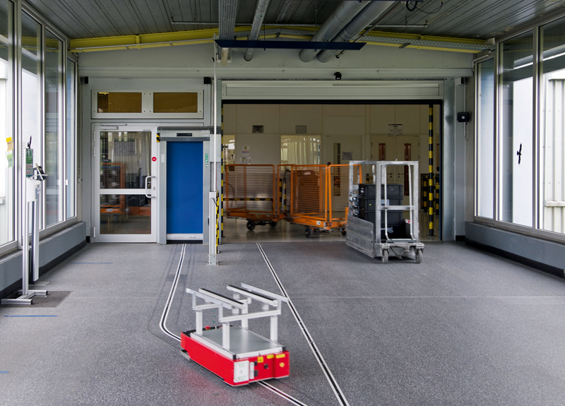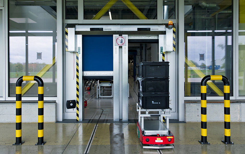 Die verwendeten Tore von Efaflex sind zwar sehr klein, aber sie sind genauso schnell und zuverlässig wie die großen Efaflex-Schnelllauftore daneben. »Früher wurden die Teile mit dem Milkrun, einem Fahrzeug mit vielen Transportanhängern, in die Hallen transportiert«, berichtet Veronique Treuheit, Abteilungsleitung Bauen von Robert Bosch Elektronik Salzgitter. »Weil mit dem Milkrun sehr viel Material auf einmal in die Hallen gefahren wurde, war eine große Fläche für die Lagerung nötig.« Um diesen Platz anderweitig zu nutzen, eine hohe Präzision im Lastentransport zu gewährleisten und um eine Verringerung der Personalbindung zu erreichen, wurden Kleine Autonome Transporteinheiten (kurz: KATE) im Werk etabliert. Die Mini-Flotte liefert die benötigten Teile punktgenau an die Produktionsstrecken. »Dadurch wären unsere großen Schnelllauftore nicht mehr nur im Dreißig-Minuten-Takt, sondern im Fünf-Minuten-Takt frequentiert worden«, erzählt Veronique Treuheit. »Für diese Belastung waren sie jedoch nicht ausgelegt. Außerdem sind unsere Hallen in Temperatur und Luftfeuchtigkeit konditioniert. Das Raumklima hätte ständig nachgeregelt werden müssen. Deshalb gab es für uns dringenden Handlungsbedarf. Mit den vier Schnelllauftoren EFA-SRT ECO im Kleinformat hat uns Efaflex eine optimale Lösung für diese Aufgabenstellung geliefert.«