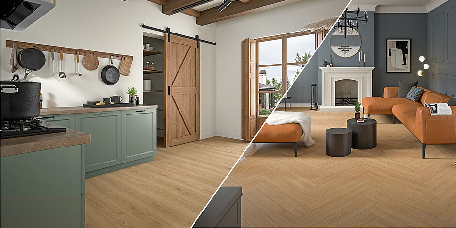 Wer auf der Suche nach einem innovativen, modernen Bodenbelag ist, kann auf den »AquaDura+« oder »AquaDura«-Böden auf Holzbasis zurückgreifen. Diese Hybridböden vereinen Design und Leistung und bieten eine holzbasierte Alternative ohne PVC oder Weichmacher zu herkömmlichen Vollkunststoffböden wie PVC, SPC oder LVT-Produkten. Das wasserdichte Klicksystem »Aqua Clic it!« schützt den Boden zuverlässig vor eindringendem Wasser, während die unlackierte Fase die natürliche Ästhetik unterstreicht. Zur Auswahl stehen insgesamt 17 verschiedene Oberflächenstrukturen.