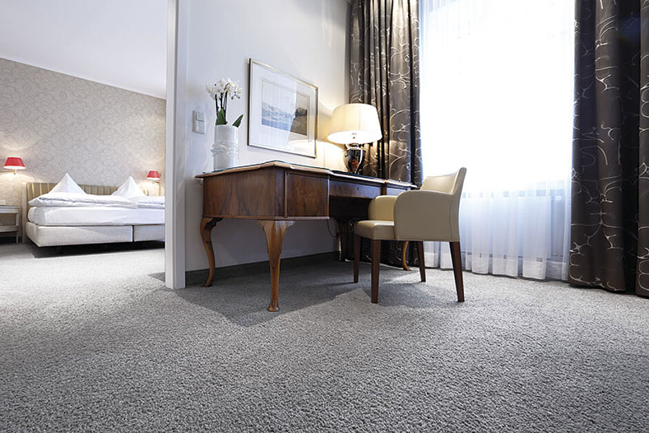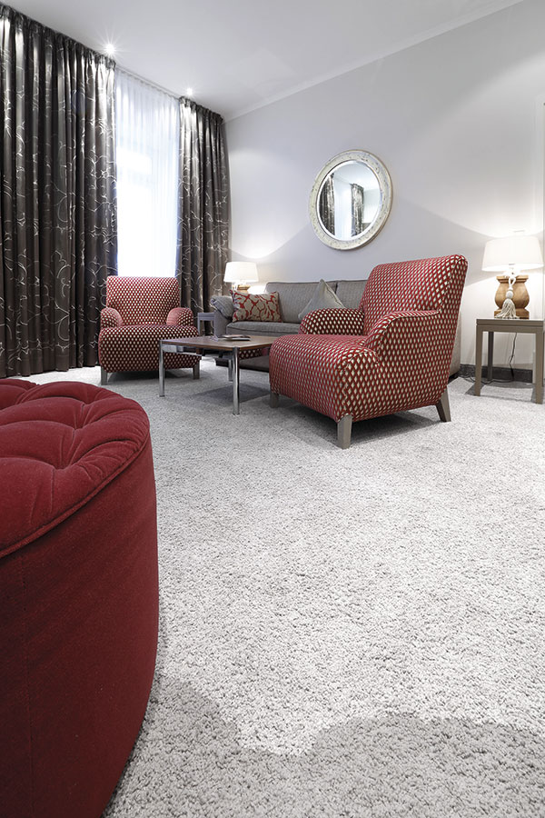 Dazu tragen wesentlich die Merkmale der Antron-Teppichfasern bei_ So sind Strapazierfähigkeit und Schmutzresistenz die wichtigsten Auswahlkriterien von Teppichfasern für Hotels. Relevant sind außerdem die Unterhaltskosten sowie unter dem Aspekt Sicherheit das Brennverhalten (cfl s1) der Teppiche. Auch das Merkmal Nachhaltigkeit können beide Girloon-Qualitäten beweisen_ Thermisch verwertbar, umweltschonend und schadstoffgeprüft sind sie außerdem mit dem »Blauen Engel« gekennzeichnet.