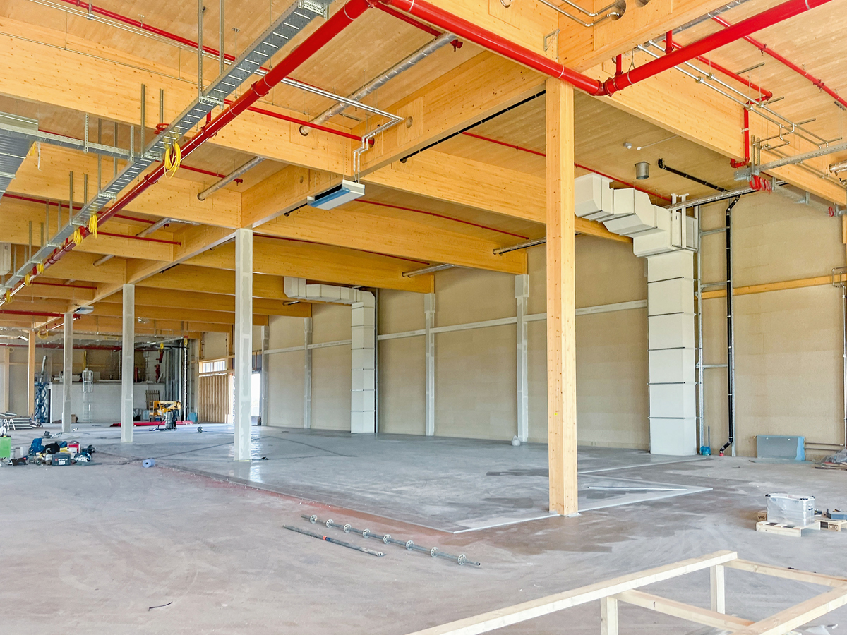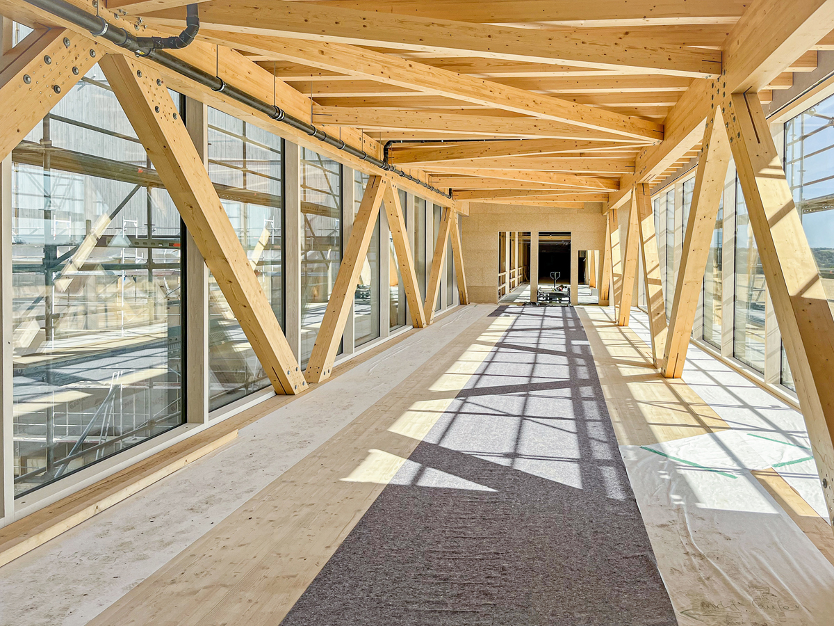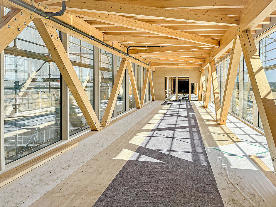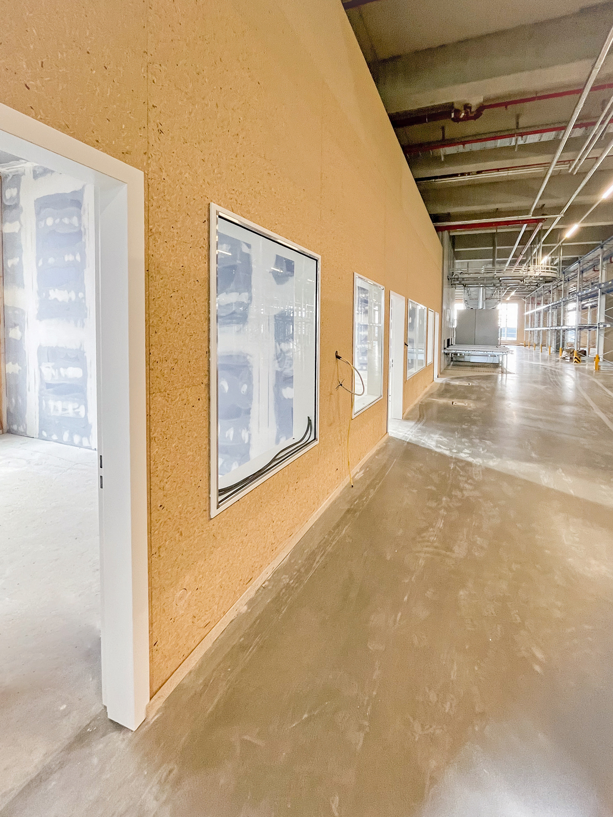 Holzbau Amann setzte für die Beplankung der Innenwände fast 2 000 m² »esb«-Platten der Firma Elka-Holzwerke aus Rheinland-Pfalz ein. Die Platten wurden nicht nur für den Logistikbereich genutzt, sondern auch als sichtbare Verkleidung der Büroräume. Dabei kann die »esb«-Platte ihre Vorzüge der geschliffenen Oberfläche, frischem Fichtenholz und Diffusionsoffenheit sehr gut ausspielen und zu einem gesunden Raumklima beitragen. Die hohe Maßgenauigkeit der Bauplatten bewährte sich auch bei fünf Meter hohen Fensterlaibungen, sie konnten mit »esb« exakt ausgeführt werden. Dank der Plattenformate von bis zu 5,20 x 2,06 m konnten auch große Flächen mit wenig Personal in kurzer Zeit beplankt werden. Die Fertigstellung des Leuchtturm-Projektes steht kurz bevor, bereits im Frühjahr 2024 sollen alle Gebäude bezogen sein.