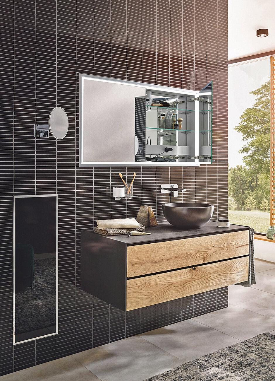 Neu sind die in Klarglas ausgeführten Randbereiche der Spiegeltüren, die das dahinter liegende LED-Licht noch wirkungsvoller zur Geltung bringen. Durch den Einsatz einer waagerechten Funktionsleiste mit integrierten Steckdosen anstelle einer senkrechten Säule konnte vor allem bei den schmalen Varianten die verfügbare Ablagefläche deutlich vergrößert werden. Weitere Ausstattungsmerkmale sind die hochwertigen Glaseinlegeböden, die sich durch dezente Träger stufenlos positionieren lassen, sowie die Scharniere mit integrierter Soft-Close-Funktion für ein sanftes Schließen der Türen. Die neuen Lichtspiegelschränke sind sowohl mit als auch ohne die neuartige Lichtsteuerung »emco light system« erhältlich. Alle Versionen ermöglichen die stufenlose Einstellung von Helligkeit und Farbtemperatur für ein persönliches Wohlfühl-Ambiente.