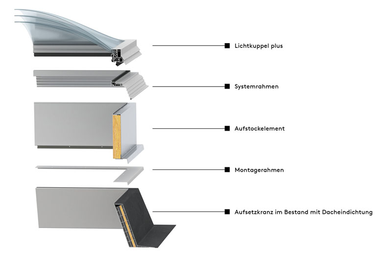 Mittels des im Lieferumfang enthaltenen Montagerahmens und Dichtungssets erfolgt eine sichere, dampfdichte und passgenaue Verbindung an bestehende Aufsetzkränze aller gängigen Fabrikate. Das Flex-Aufstocksystem steht zur individuellen Größen- und Geometrieanpassung an Bestands-Aufsetzkränze zur Verfügung.