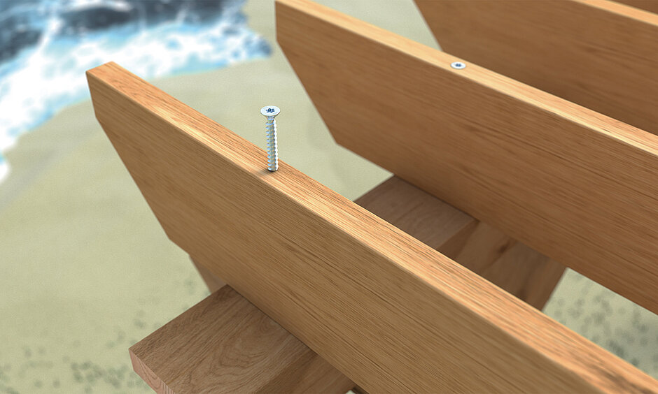 Für korrosionsbeständige Holzverbindungen z. B. in Küsten- und Industrieatmosphären oder stark verschmutzten urbanen Gebieten hat Eurotec die KonstruX Vollgewindeschrauben in Edelstahl A4 im Produktsortiment. Die Schrauben eignen sich aufgrund ihrer guten Korrosionsbeständigkeit ideal für die Befestigung gerbstoffhaltiger Hölzer und bieten zuverlässige Verbindungen in aggressiven und salzhaltigen Umgebungen (A4 T5/CRC III), sodass sie eine gute Wahl für Anwendungen in Außenumgebungen darstellen