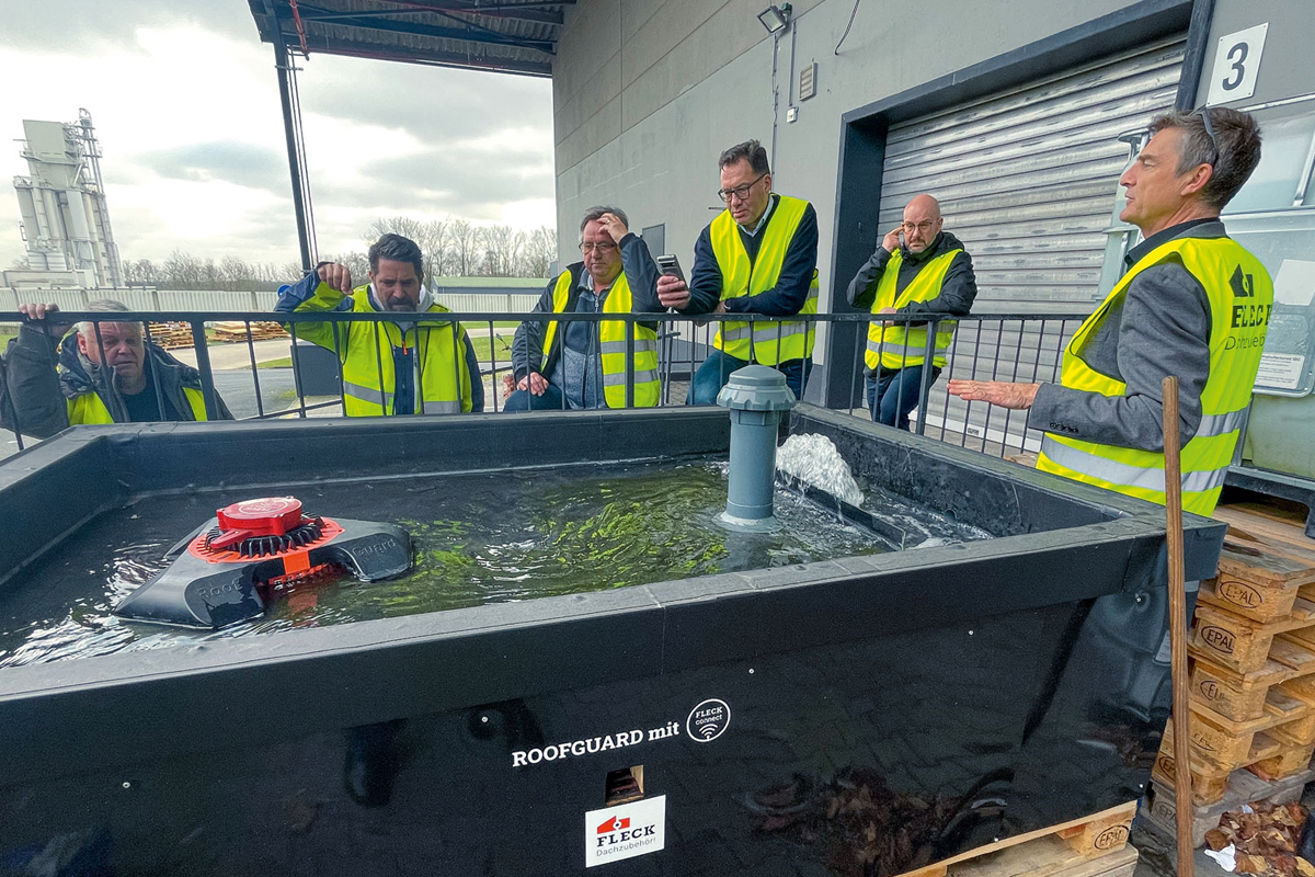 Die Funktionsweise des »Roofguards« wurde den Mitgliedern der Planungsgruppe Dach im Anschluss an die mündliche Vorstellung der Fleck GmbH im Zuge einer Werksführung an einem Flachdach-Modell demonstriert. »Spannend, wie ein Ablauf sich durch den Einsatz einer innovativen Technik ›selbst reinigen‹ kann. Eine Wartung ersetzt ein solches Produkt natürlich nicht, es minimiert jedoch das Risiko verstopfter Dach-Abläufe deutlich«, fasst Stefan Ibold zusammen.