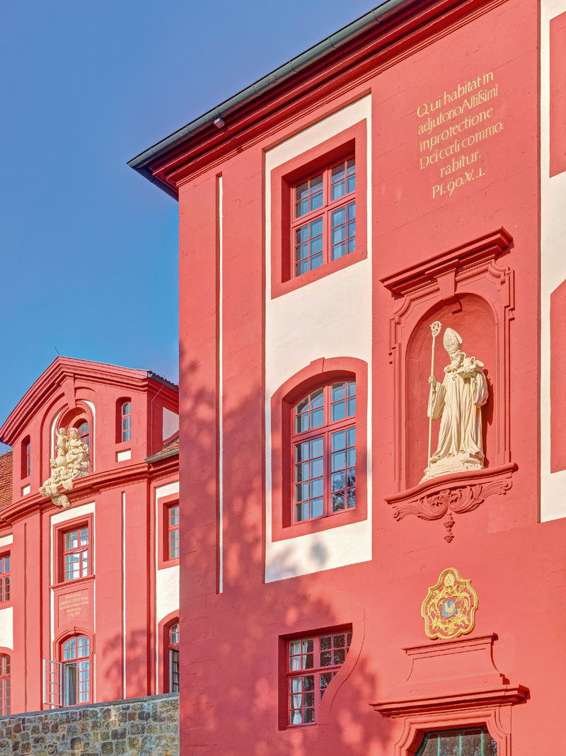 Dunkelrote Anstriche an zum Beispiel Eckquadern, Fenster- und Türgewänden gliedern die Architektur. »Für diesen Anstrich eignete sich besonders ›Histolith Fassaden-Emulsionsfarbe‹, da diese wasserabweisend, dabei gleichermaßen dampfdiffusionsoffen ist – dadurch wird ein idealer Feuchteschutz für den Sandstein bewirkt«, weiß Brandes.