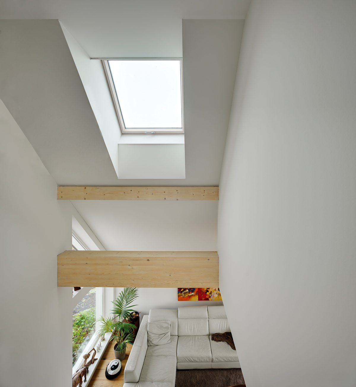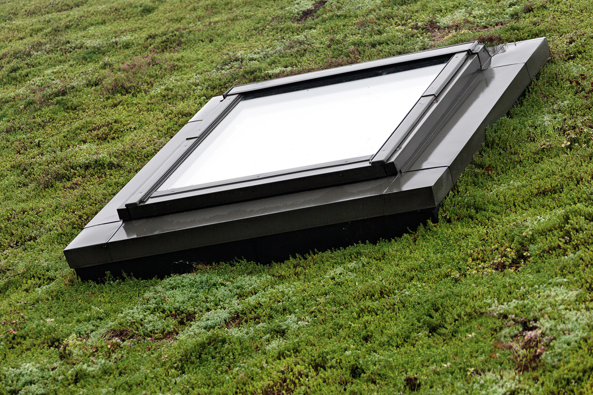 Ziel des Projekts war ein Gebäude, das sich perfekt in die Umgebung einfügt. Das Dach begeistert mit seiner außergewöhnlichen Optik. Ein wichtiger Vorteil dieser Dacheindeckung ist die natürliche Wärme- und Schalldämmung des Gebäudes. Die eingebauten Fakro-Dachfenster »FTP-V« leiten viel natürliches Licht ins Dachgeschoss. Außerdem gewährleisteten sie eine hervorragende Dämmung an einem besonders feuchtigkeitsgefährdeten Ort, dem Anschluss des Fensters an das Dach.