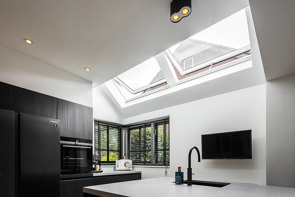 Die Eigentümer eines Hauses in Groesbeek (NL) haben kürzlich ihre Küche renoviert. Durch das zusätzliche natürliche Licht ist ihr neues Kochparadies nun wesentlich heller. In die Dachschrägen wurden zwei elektrisch schwenkbare Oberlichter (»FTU-V Z-Wave«) eingebaut. Da die Fenster höher montiert sind, lassen sie mehr natürliches Licht herein als normal eingebaute Dachflächenfenster. Mit der Fernbedienung oder einem Gateway mit einem Smartphone lassen sie sich aus der Ferne öffnen und schließen.