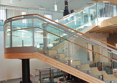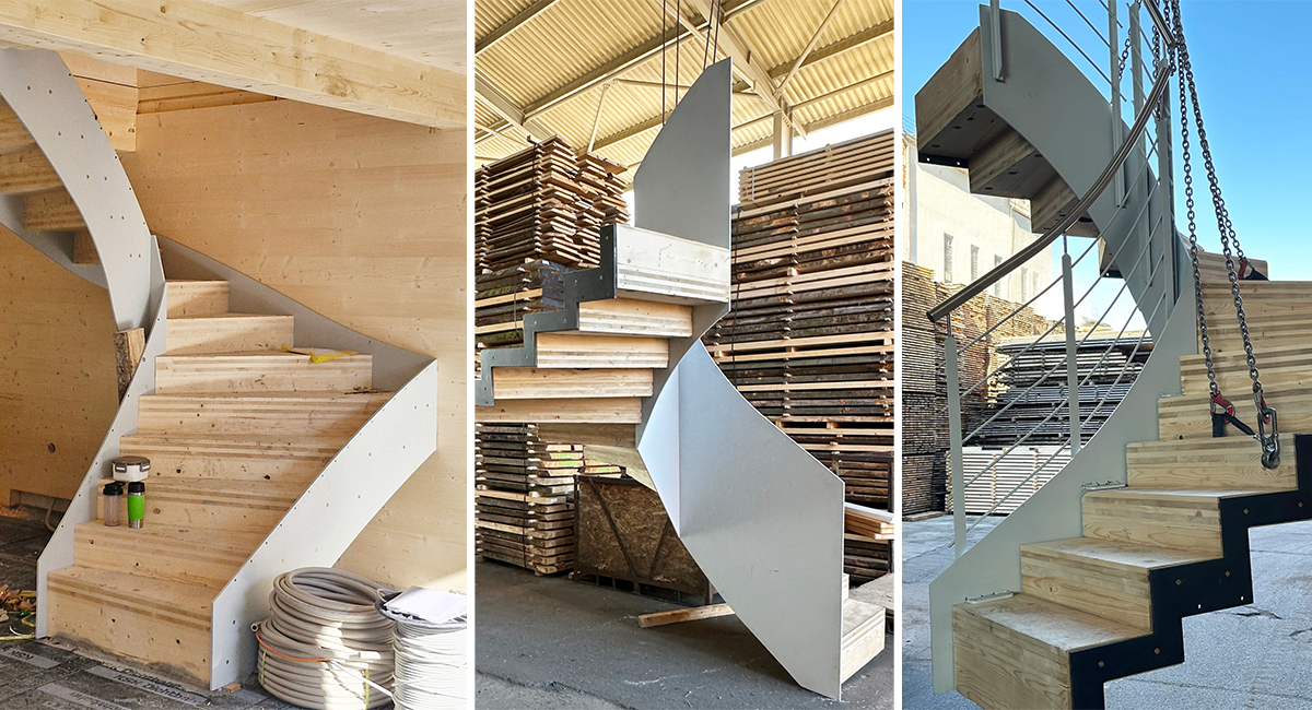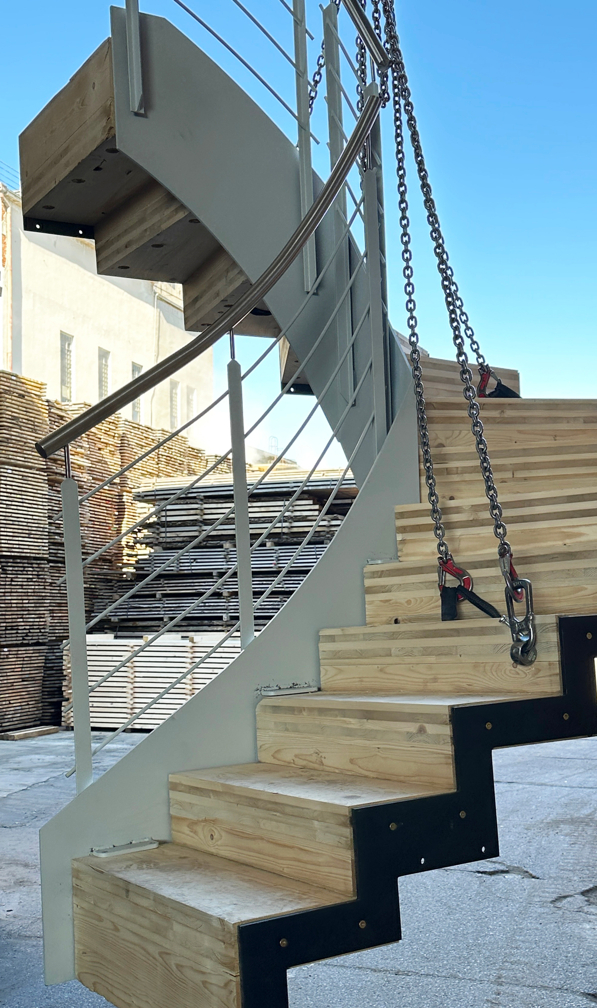 Neu bietet FHS nun auch die Vormontage von Wangen und Geländern in Stahl an. Das können klassische Stahlwangen mit verschiedensten Geländer-Ausführungen sein oder auch die derzeit gefragten Stahl-Scheibengeländer. Alles kommt fix und fertig per Lkw auf der Baustelle an und wird in kurzer Zeit mit dem Kran in das Gebäude eingehoben. Mehrere Geschosse passen dabei perfekt aufeinander und schon ist die Bautreppe fertig!