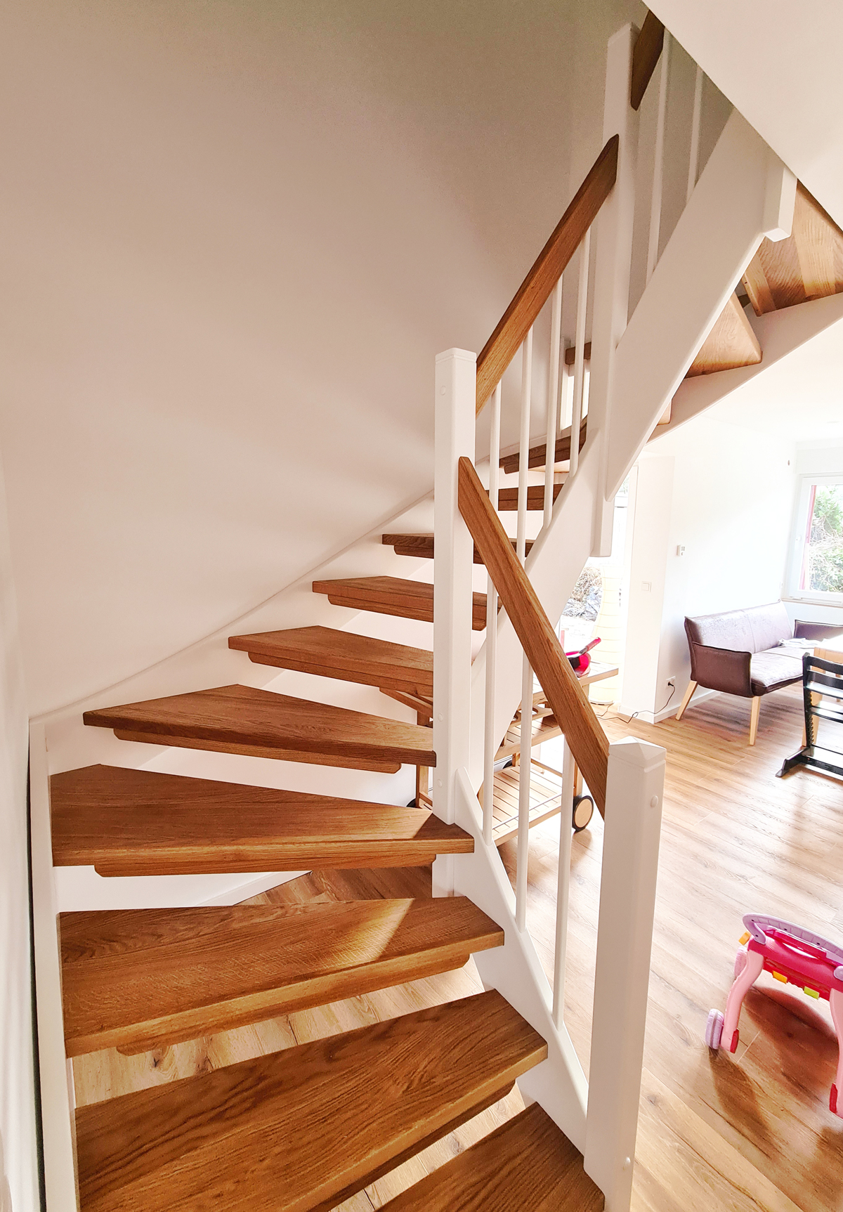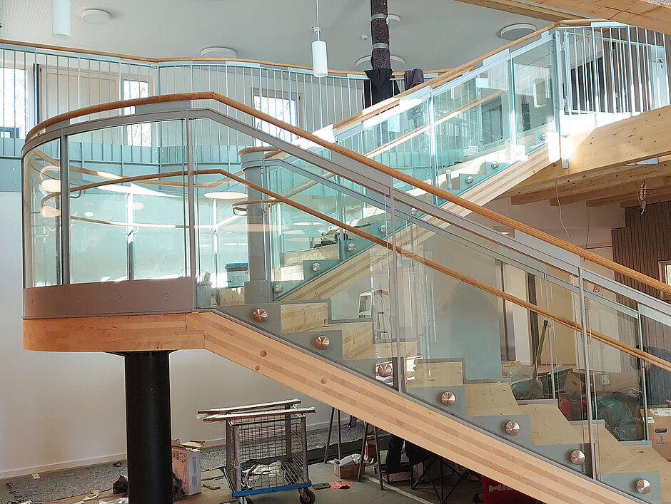 Ein nahezu einzigartiges Produkt und eine großartige Alternative zur Betontreppe bietet FHS mit der vormontierten Treppe aus Brettsperrholz: Sie ist schnell mit dem Kran eingehoben, sofort als Bautreppe verwendbar und kann am Ende dank im Werk vorliegender CAD-Dateien ohne weiteres Aufmaß mit Holzstufen und Geländern in Holz, Glas, Stahl oder Edelstahl von FHS fertiggestellt werden! Inzwischen liefert FHS die BSP-Fertigtreppe auf Wunsch auch einschließlich montierter Stahlwangen und -Geländer und erspart so einen weiteren Arbeitsschritt am Bau. Selbst die modernen Stahl-Scheibengeländer sind vormontiert erhältlich. Die BSP-Treppen eignen sich auch für bauseitige Stufenbeläge wie Fliesen oder Stein.