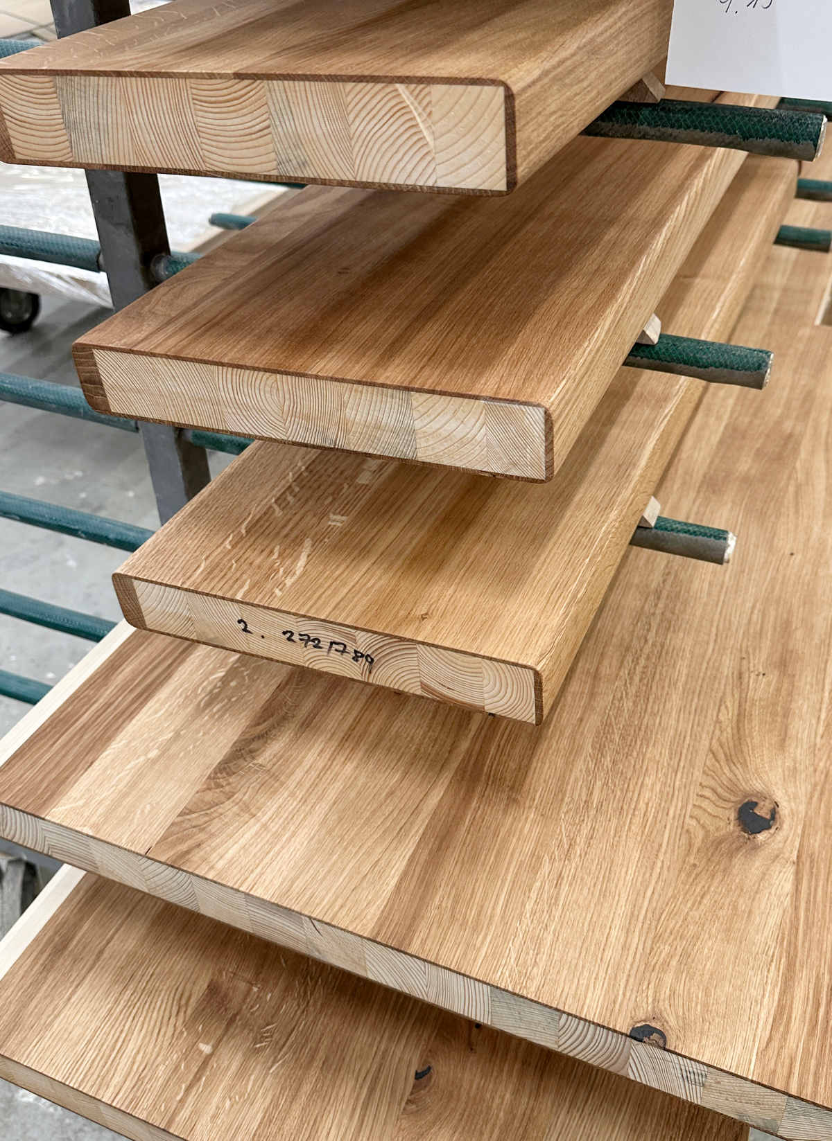 Eine Besonderheit bietet FHS mit der »F-Eiche« für Treppenstufen und Tisch- und Arbeitsplatten: Ca 3.5 mm starkes Eiche-Sägefurnier bildet an Ober- und Unterseite eines Kerns aus massiver keilgezinkter Fichte eine edle, robuste und langlebige Nutzschicht. Für die Montage zwischen Holz- oder Stahlwangen bzw. zwischen Wänden erhalten die Stufen massive Eiche-Anleimer in vorne ca. 20 mm und hinten ca. 4 mm Stärke. Sofern auch die Seiten der Stufen nach der Montage sichtbar sein sollen – z.B. für Stufen auf Beton oder Stahlholmtreppen – wird die keilgezinkte Fichte an den Seiten zusätzlich mit Hirnholz in Eiche veredelt. Dieses ist ca. 5 cm tief und kann bei Bedarf auch noch etwas gekürzt werden. Die Seiten der Tisch- und Arbeitsplatten werden nach Vorgabe gefertigt. So sind die Stufen oder Platten von reinen Eiche-Elementen kaum mehr zu unterscheiden! Der Vorteil: die »F-Eiche« ist nicht nur günstiger als massive Eiche, die Stufen und Platten sind auch deutlich leichter und daher einfacher zu handhaben. Bei größeren Flächen wie Tischplatten oder Podeste minimiert sich die Neigung zum Verwerfen oder Reißen. Das Verfahren ist auch für andere teure Holzarten anwendbar, z.B. für Räuchereiche oder Amerikanischen Nussbaum.