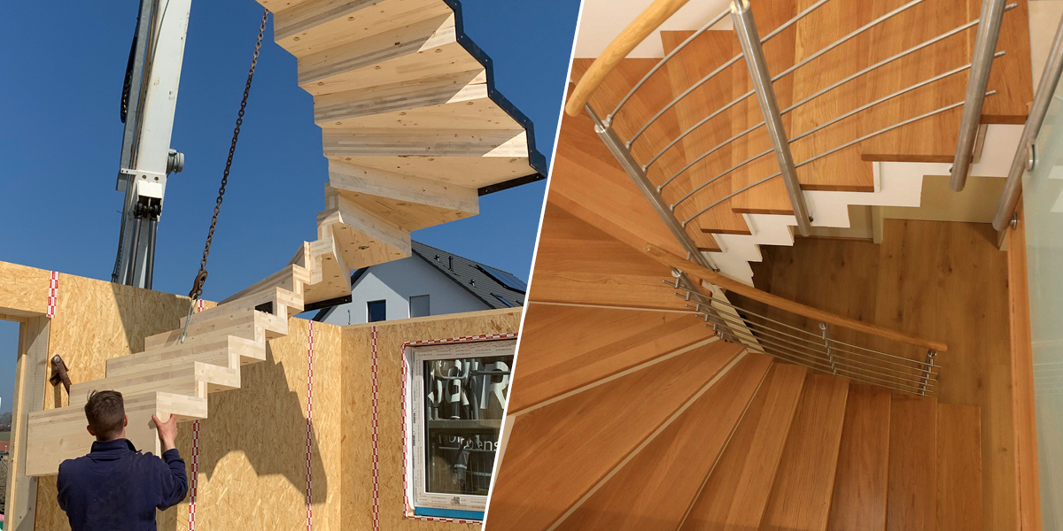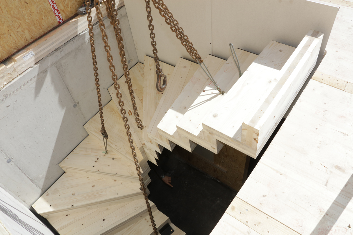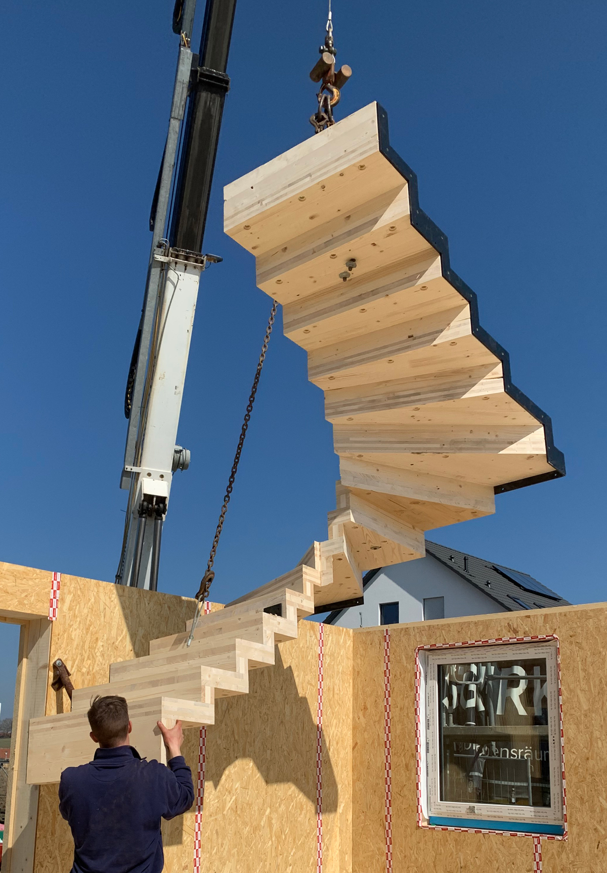 Die Fertigtreppe aus Brettsperrholz wird mit dem Kran in das Gebäude eingehoben, verschraubt und ist sofort als Bautreppe nutzbar. Auch für die spätere Fertigstellung der Treppe als Wohnraum-Treppe mit Stufen und Geländern ist schon vorgesorgt: Dank der im Werk vorliegenden CAD-Dateien ist kein erneutes Aufmaß auf der Baustelle erforderlich, lediglich die Wünsche des Endkunden – Holzauswahl, Geländer-Materialien (Holz, Stahl, Glas, Edelstahl) – sind noch zu erfassen.