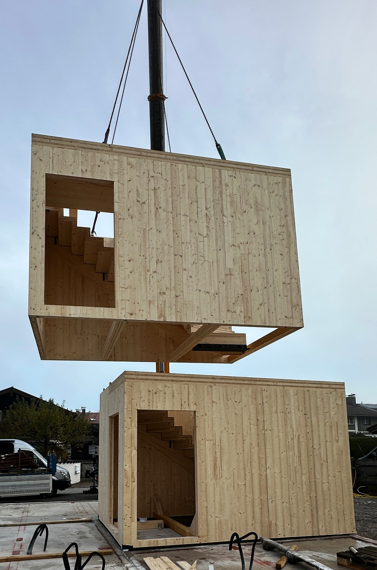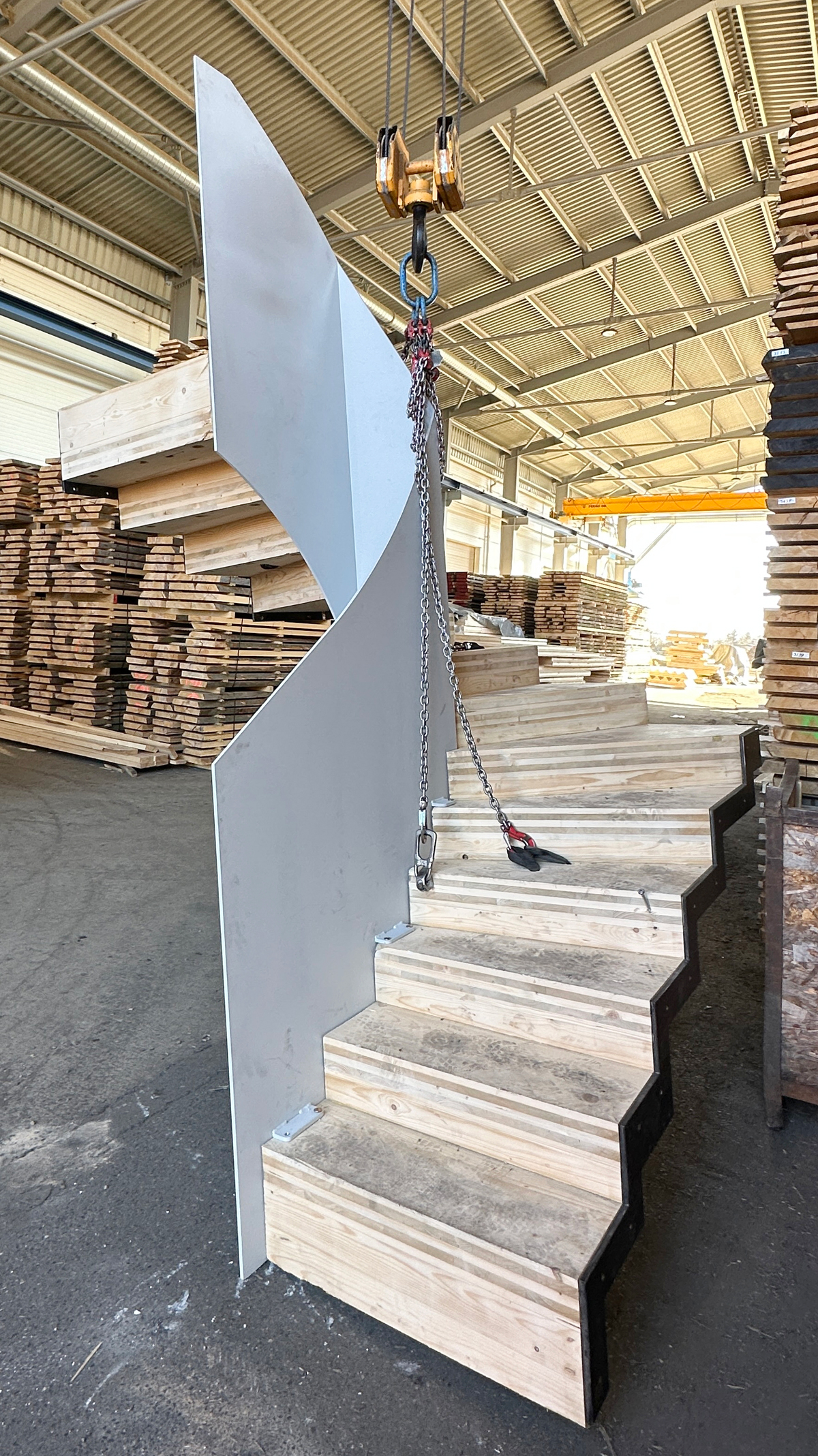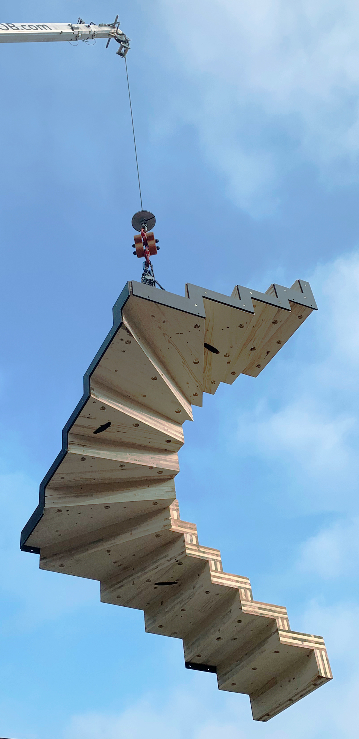 Die Fertigtreppe aus Brettsperrholz wird mit dem Kran in das Gebäude eingehoben, verschraubt und ist sofort als Bautreppe nutzbar. Auch für die spätere Fertigstellung der Treppe als Wohnraum-Treppe mit Stufen und Geländern ist schon vorgesorgt: Dank der im Werk vorliegenden CAD-Dateien ist kein erneutes Aufmaß auf der Baustelle erforderlich, lediglich die Wünsche des Endkunden – Holzauswahl, Geländer-Materialien (Holz, Stahl, Glas, Edelstahl) – sind noch zu erfassen.