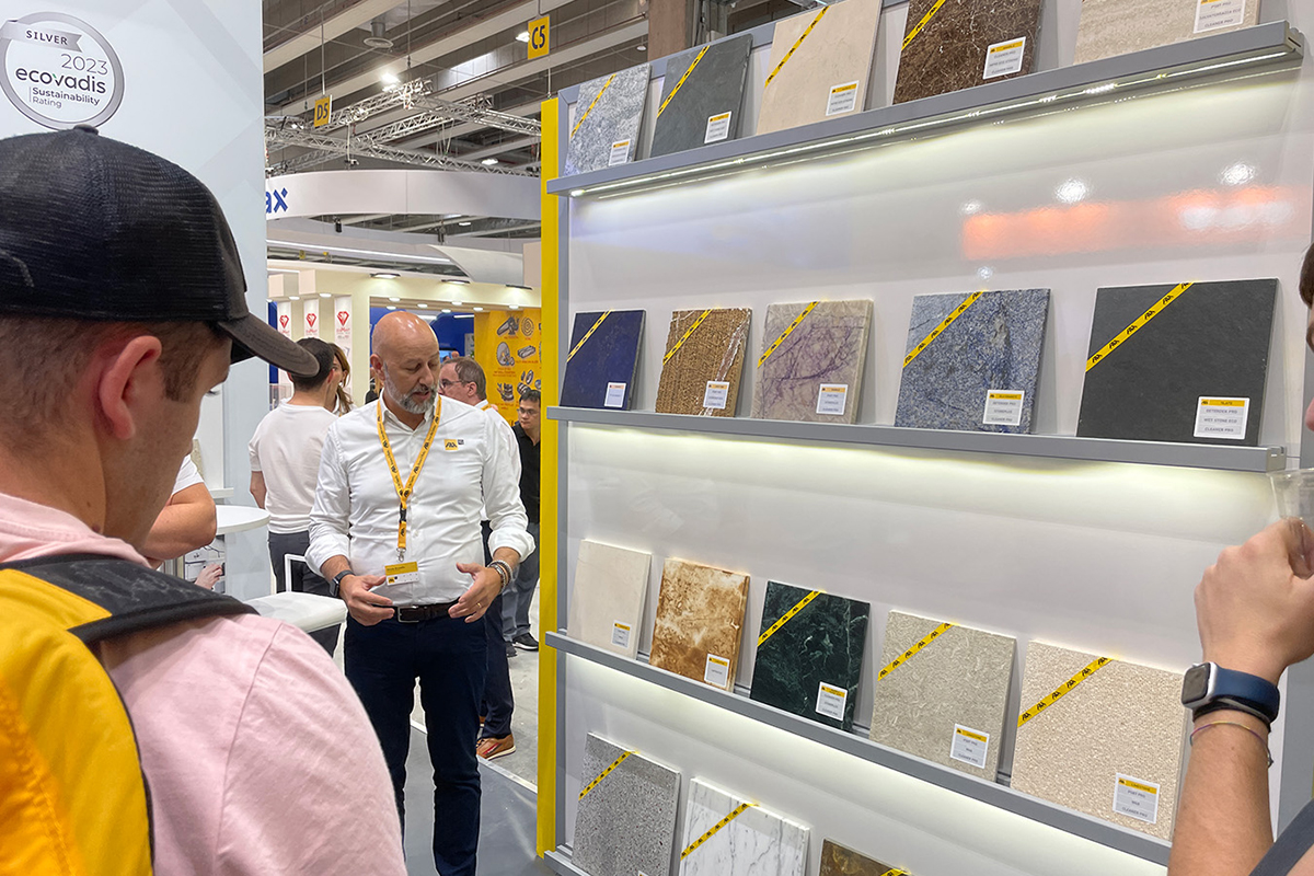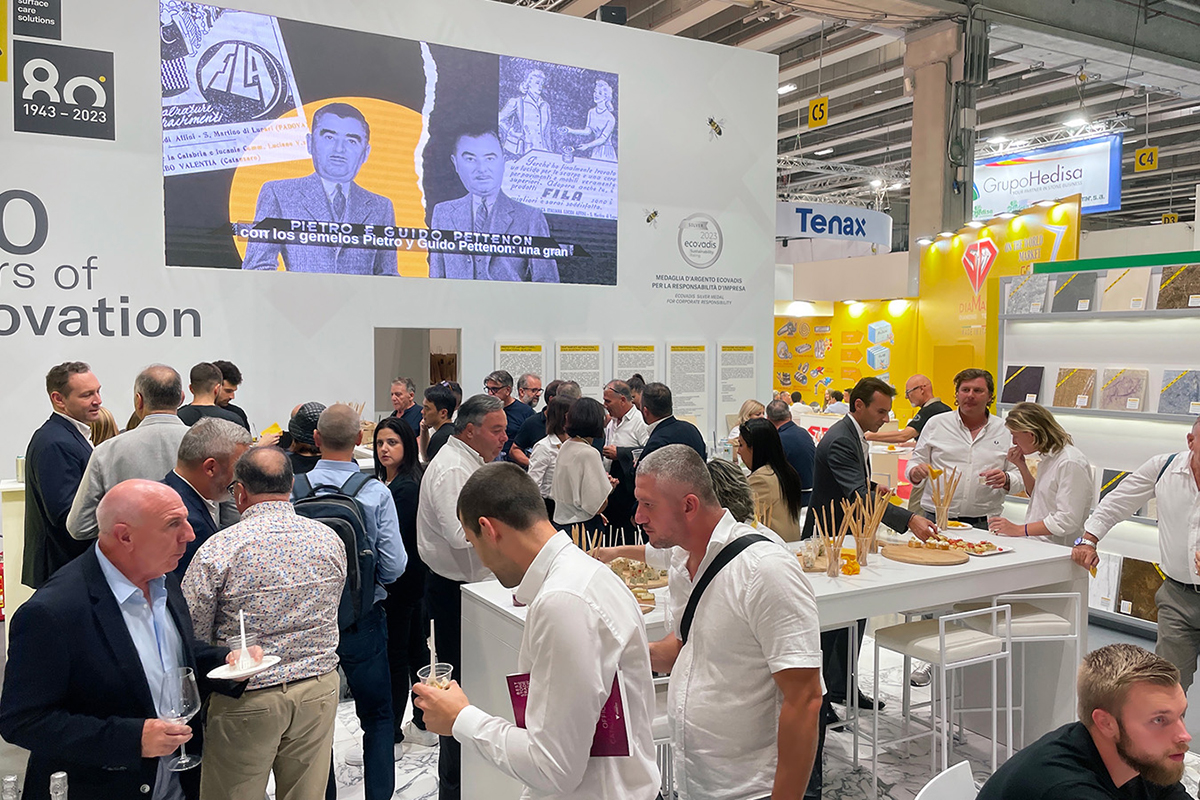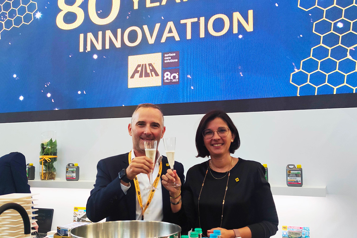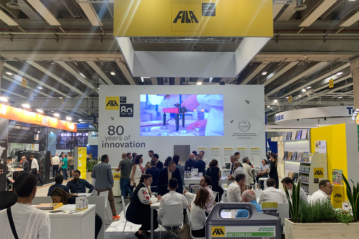 Fila Solutions hatte 80 Jahre Innovation im Gepäck und zeigte auf der Cersaie und der Marmomac zertifiziert nachhaltige Produkte und Lösungen für Reinigung, Schutz und Pflege von Oberflächen. Drei Reiniger aus dem firmeneigenen Forschungszentrum haben mit ihren Multitasking-Eigenschaften einen maßgeblichen Beitrag zum Erfolg des Unternehmens geleistet, heißt es in einer Mitteilung von Fila Solutions. Als wichtiger Bestandteil des anwendungsfreundlichen Produktsortiments reichen die »drei Musketiere« »Deterdek Pro«, »Cleaner Pro« und »PS87 Pro« laut Hersteller aus, um organischen und anorganischen Schmutz, also Zementschleier, Flecken, Fett und Wachs von unterschiedlichen Belägen, wie Fliesen und Naturstein, Laminat, Vinylböden und Beton zu entfernen. Innovative Schutzmittel mit Mikrotechnologie wie der Fleckschutz »MP90 Eco Xtreme« und der »Wet Eco«, ein erneuerbarer bzw. entfernbarer farbtonvertiefender Schutz mit Nasseffekt, vervollständigen das Profisortiment.