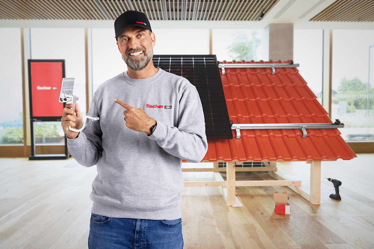 Neben dem Kennenlernen der Services legt Jürgen Klopp auch selbst Hand an und testet in den Videos fischer Produkte. So überzeugt er sich von den Vorteilen der »PowerFast II«-Schrauben und den Solarbefestigungen des Befestigungsspezialisten.
